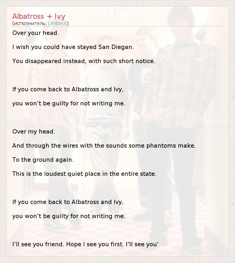 Over your head. I wish you could have stayed San Diegan. You disappeared instead, with such short notice. If you come back to Albatross and Ivy, you won't be guilty for not writing me. Over my head. And through the wires with the sounds some phantoms make. To the ground again. This is the loudest quiet place in the entire state. If you come back to Albatross and Ivy, you won't be guilty for not writing me. I'll see you friend. Hope I see you first. I'll see you'