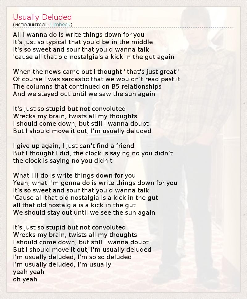 All I wanna do is write things down for you It's just so typical that you'd be in the middle It's so sweet and sour that you'd wanna talk 'cause all that old nostalgia's a kick in the gut again When the news came out I thought "that's just great" Of course I was sarcastic that we wouldn't read past it The columns that continued on B5 relationships And we stayed out until we saw the sun again It's just so stupid but not convoluted Wrecks my brain, twists all my thoughts I should come down, but still I wanna doubt But I should move it out, I'm usually deluded I give up again, I just can't find a friend But I thought I did, the clock is saying no you didn't the clock is saying no you didn't What I'll do is write things down for you Yeah, what I'm gonna do is write things down for you It's so sweet and sour that you'd wanna talk 'Cause all that old nostalgia is a kick in the gut all that old nostalgia is a kick in the gut We should stay out until we see the sun again It's just so stupid but not convoluted Wrecks my brain, twists all my thoughts I should come down, but still I wanna doubt But I should move it out, I'm usually deluded I'm usually deluded, I'm so so deluded I'm usually deluded, I'm usually yeah yeah oh yeah