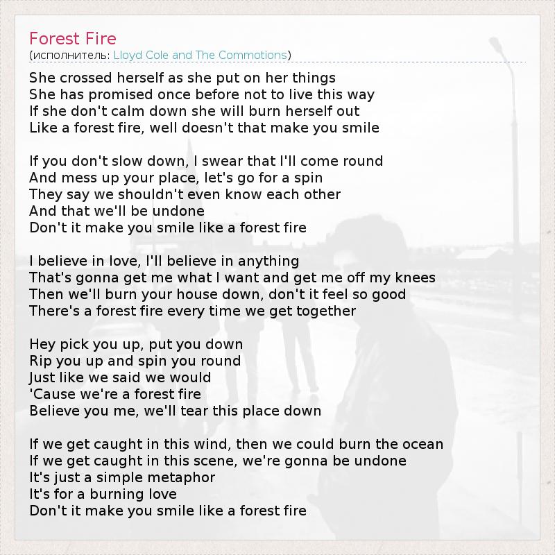 She crossed herself as she put on her things She has promised once before not to live this way If she don't calm down she will burn herself out Like a forest fire, well doesn't that make you smile If you don't slow down, I swear that I'll come round And mess up your place, let's go for a spin They say we shouldn't even know each other And that we'll be undone Don't it make you smile like a forest fire I believe in love, I'll believe in anything That's gonna get me what I want and get me off my knees Then we'll burn your house down, don't it feel so good There's a forest fire every time we get together Hey pick you up, put you down Rip you up and spin you round Just like we said we would 'Cause we're a forest fire Believe you me, we'll tear this place down If we get caught in this wind, then we could burn the ocean If we get caught in this scene, we're gonna be undone It's just a simple metaphor It's for a burning love Don't it make you smile like a forest fire