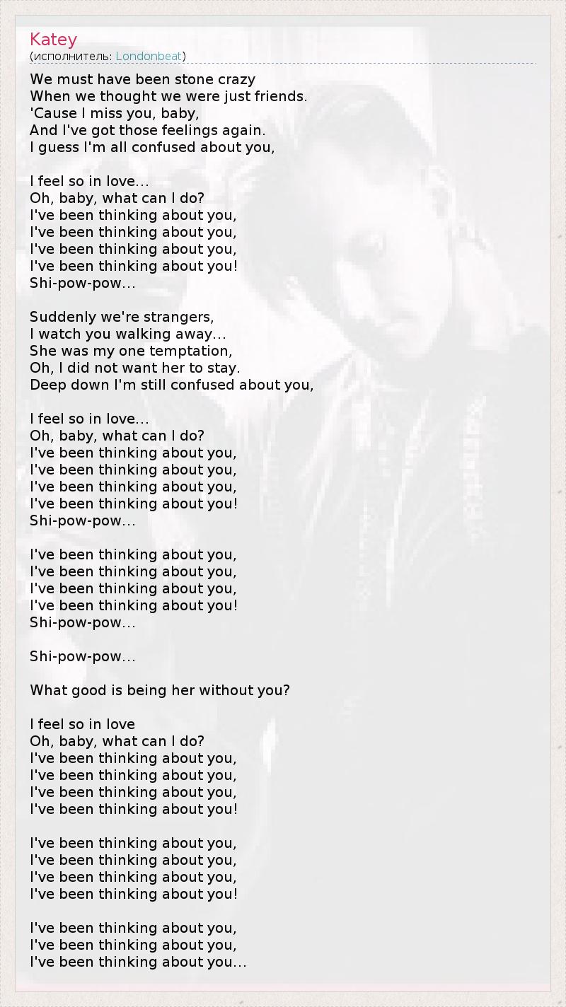 We must have been stone crazy When we thought we were just friends. 'Cause I miss you, baby, And I've got those feelings again. I guess I'm all confused about you, I feel so in love… Oh, baby, what can I do? I've been thinking about you, I've been thinking about you, I've been thinking about you, I've been thinking about you! Shi-pow-pow… Suddenly we're strangers, I watch you walking away… She was my one temptation, Oh, I did not want her to stay. Deep down I'm still confused about you, I feel so in love… Oh, baby, what can I do? I've been thinking about you, I've been thinking about you, I've been thinking about you, I've been thinking about you! Shi-pow-pow… I've been thinking about you, I've been thinking about you, I've been thinking about you, I've been thinking about you! Shi-pow-pow… Shi-pow-pow… What good is being her without you? I feel so in love Oh, baby, what can I do? I've been thinking about you, I've been thinking about you, I've been thinking about you, I've been thinking about you! I've been thinking about you, I've been thinking about you, I've been thinking about you, I've been thinking about you! I've been thinking about you, I've been thinking about you, I've been thinking about you…