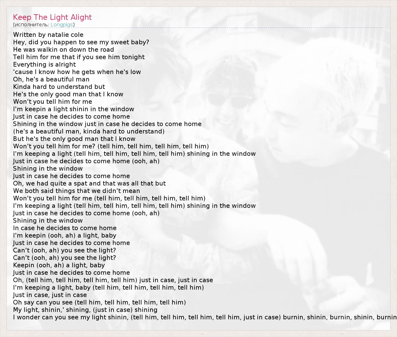 Written by natalie cole Hey, did you happen to see my sweet baby? He was walkin on down the road Tell him for me that if you see him tonight Everything is alright 'cause I know how he gets when he's low Oh, he's a beautiful man Kinda hard to understand but He's the only good man that I know Won't you tell him for me I'm keepin a light shinin in the window Just in case he decides to come home Shining in the window just in case he decides to come home (he's a beautiful man, kinda hard to understand) But he's the only good man that I know Won't you tell him for me? (tell him, tell him, tell him, tell him) I'm keeping a light (tell him, tell him, tell him, tell him) shining in the window Just in case he decides to come home (ooh, ah) Shining in the window Just in case he decides to come home Oh, we had quite a spat and that was all that but We both said things that we didn't mean Won't you tell him for me (tell him, tell him, tell him, tell him) I'm keeping a light (tell him, tell him, tell him, tell him) shining in the window Just in case he decides to come home (ooh, ah) Shining in the window In case he decides to come home I'm keepin (ooh, ah) a light, baby Just in case he decides to come home Can't (ooh, ah) you see the light? Can't (ooh, ah) you see the light? Keepin (ooh, ah) a light, baby Just in case he decides to come home Oh, (tell him, tell him, tell him, tell him) just in case, just in case I'm keeping a light, baby (tell him, tell him, tell him, tell him) Just in case, just in case Oh say can you see (tell him, tell him, tell him, tell him) My light, shinin,' shining, (just in case) shining I wonder can you see my light shinin, (tell him, tell him, tell him, tell him, just in case) burnin, shinin, burnin, shinin, burnin