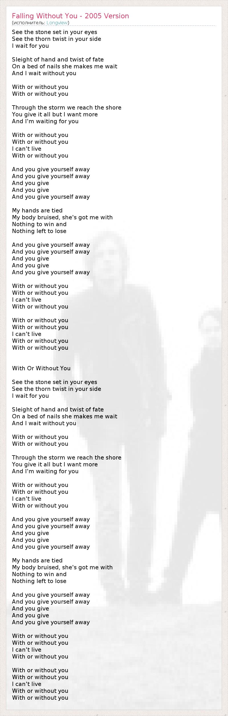 Ты смотришь на меня холодным взглядом, Едва сдерживая раздражение, А я жду тебя. Ловкое движение руки – и две судьбы сплелись в одну. Я томлюсь ожиданием на ложе из гвоздей. И я жду без тебя. С тобой или без тебя... С тобой или без тебя... Преодолев шторм, мы достигаем берега. Ты отдаёшь всю себя, но я хочу большего, И я жду тебя. С тобой или без тебя... С тобой или без тебя... Я не могу жить С тобой или без тебя... Ты отдаёшь всю себя... Ты отдаёшь всю себя... Ты отдаёшь... Ты отдаёшь... Ты отдаёшь всю себя... Мои руки связаны, Моё тело покрыто ранами. Ты сделала так, Что мне уже не выйти победителем, Но и проигрывать тоже нечего. Ты отдаёшь всю себя... Ты отдаёшь всю себя... Ты отдаёшь... Ты отдаёшь... Ты отдаёшь всю себя... С тобой или без тебя... С тобой или без тебя... Я не могу жить С тобой или без тебя... С тобой или без тебя... С тобой или без тебя... Я не могу жить С тобой или без тебя... С тобой или без тебя... С тобой или без тебя* (перевод Наталья из Москвы) Твой холодный нежный взгляд Раскрывает твой наряд. А я жду тебя. Легкий взмах твоей руки, И две судьбы так близки. И я жду без тебя. Я с тобой Или без тебя. После шторма, ты любя Отдаешь мне всю себя. И я жду тебя. Я с тобой Или без тебя. Я не могу так. С тобой или без тебя. Ты отдашь мне всю себя. Ты отдашь мне всю себя. Ты отдашь... Ты отдашь... Ты отдашь мне всю себя. Мои руки связаны. Тело в синяках. Она сделала так, Что я не выиграл, Но ничего не потерял. Ты отдашь мне всю себя. Ты отдашь мне всю себя. Ты отдаешь... Ты отдаешь... Ты отдаешь мне всю себя. Я с тобой Или без тебя. Я не могу так. С тобой или без тебя. Я с тобой Или без тебя. Я не могу так. С тобой или без тебя, С тобой или без тебя. * поэтический перевод с элементами творческой интерпретации