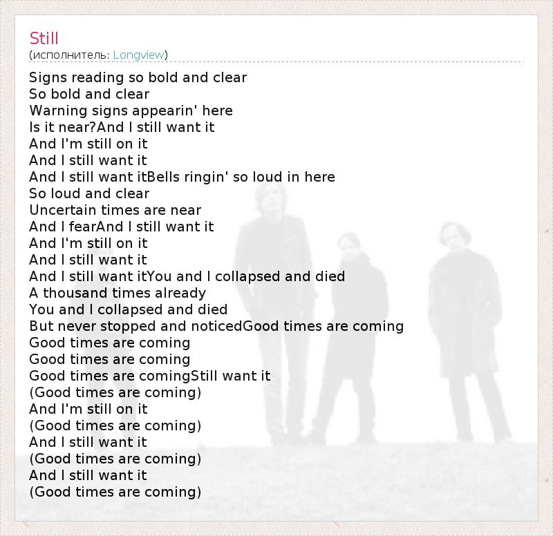 Signs reading so bold and clear So bold and clear Warning signs appearin' here Is it near?And I still want it And I'm still on it And I still want it And I still want itBells ringin' so loud in here So loud and clear Uncertain times are near And I fearAnd I still want it And I'm still on it And I still want it And I still want itYou and I collapsed and died A thousand times already You and I collapsed and died But never stopped and noticedGood times are coming Good times are coming Good times are coming Good times are comingStill want it (Good times are coming) And I'm still on it (Good times are coming) And I still want it (Good times are coming) And I still want it (Good times are coming)