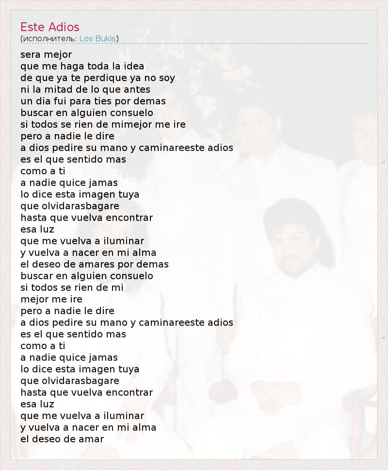 sera mejor que me haga toda la idea de que ya te perdique ya no soy ni la mitad de lo que antes un dia fui para ties por demas buscar en alguien consuelo si todos se rien de mimejor me ire pero a nadie le dire a dios pedire su mano y caminareeste adios es el que sentido mas como a ti a nadie quice jamas lo dice esta imagen tuya que olvidarasbagare hasta que vuelva encontrar esa luz que me vuelva a iluminar y vuelva a nacer en mi alma el deseo de amares por demas buscar en alguien consuelo si todos se rien de mi mejor me ire pero a nadie le dire a dios pedire su mano y caminareeste adios es el que sentido mas como a ti a nadie quice jamas lo dice esta imagen tuya que olvidarasbagare hasta que vuelva encontrar esa luz que me vuelva a iluminar y vuelva a nacer en mi alma el deseo de amar