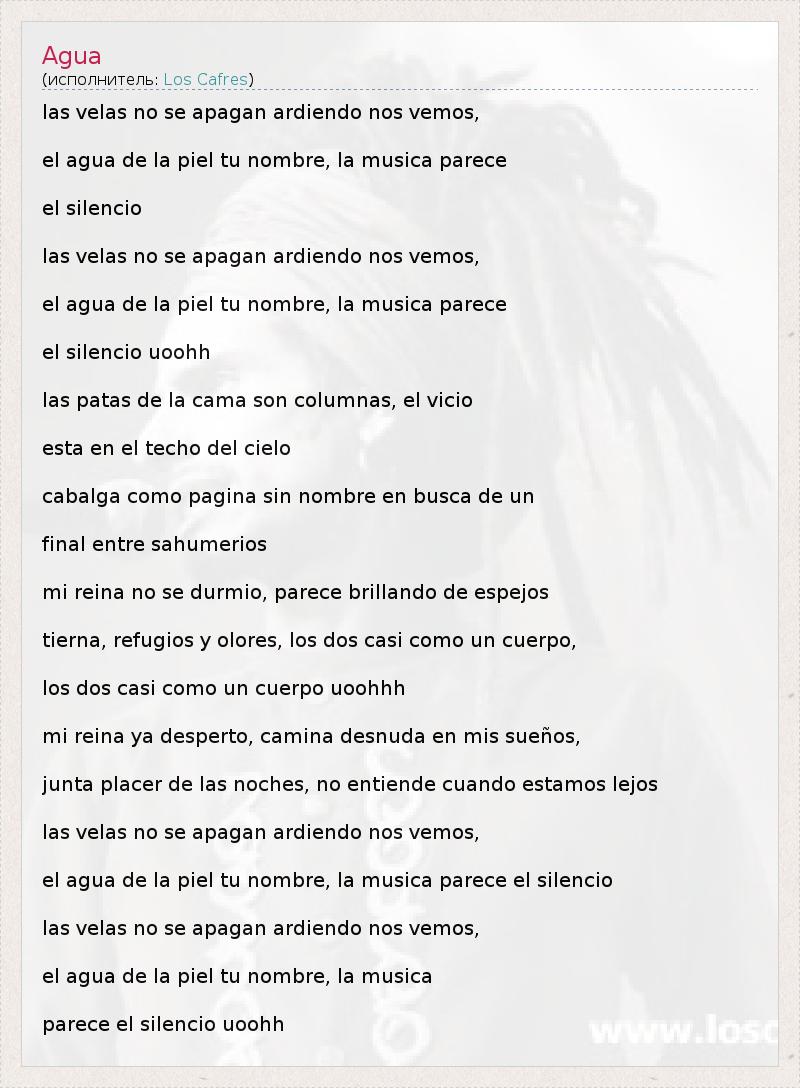 las velas no se apagan ardiendo nos vemos, el agua de la piel tu nombre, la musica parece el silencio las velas no se apagan ardiendo nos vemos, el agua de la piel tu nombre, la musica parece el silencio uoohh las patas de la cama son columnas, el vicio esta en el techo del cielo cabalga como pagina sin nombre en busca de un final entre sahumerios mi reina no se durmio, parece brillando de espejos tierna, refugios y olores, los dos casi como un cuerpo, los dos casi como un cuerpo uoohhh mi reina ya desperto, camina desnuda en mis sueños, junta placer de las noches, no entiende cuando estamos lejos las velas no se apagan ardiendo nos vemos, el agua de la piel tu nombre, la musica parece el silencio las velas no se apagan ardiendo nos vemos, el agua de la piel tu nombre, la musica parece el silencio uoohh