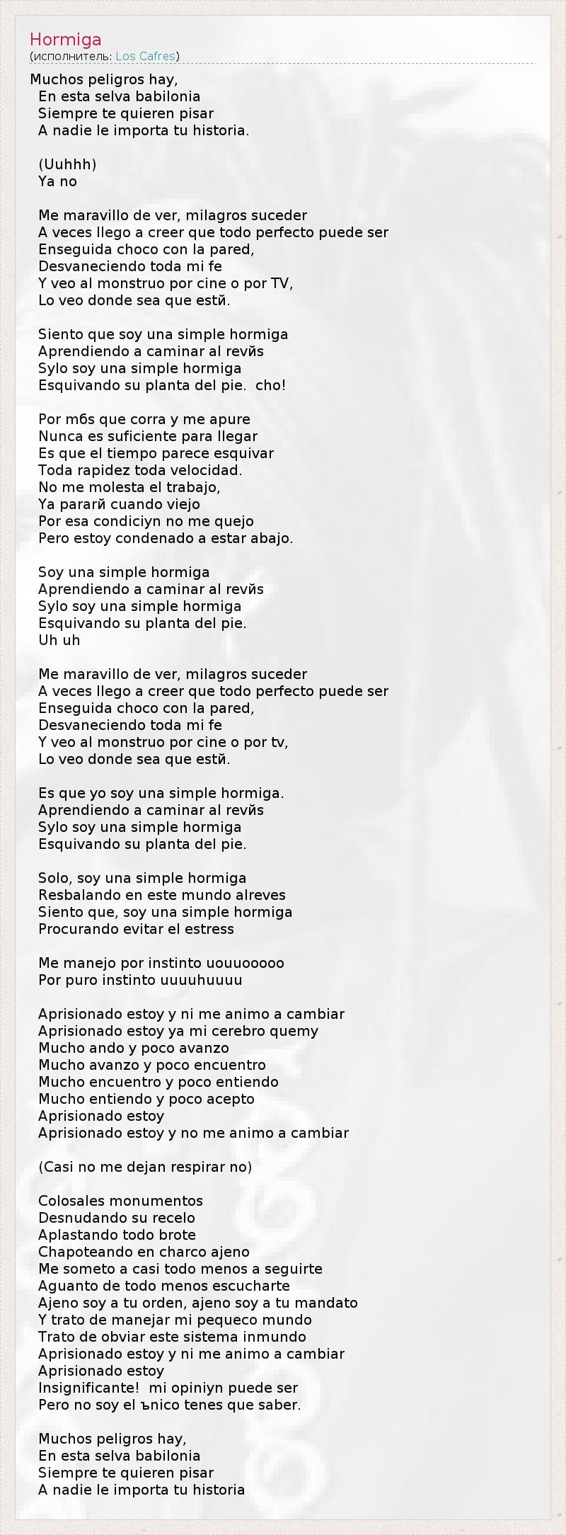 Muchos peligros hay, En esta selva babilonia Siempre te quieren pisar A nadie le importa tu historia. (Uuhhh) Ya no Me maravillo de ver, milagros suceder A veces llego a creer que todo perfecto puede ser Enseguida choco con la pared, Desvaneciendo toda mi fe Y veo al monstruo por cine o por TV, Lo veo donde sea que estй. Siento que soy una simple hormiga Aprendiendo a caminar al revйs Sуlo soy una simple hormiga Esquivando su planta del pie. cho! Por mбs que corra y me apure Nunca es suficiente para llegar Es que el tiempo parece esquivar Toda rapidez toda velocidad. No me molesta el trabajo, Ya pararй cuando viejo Por esa condiciуn no me quejo Pero estoy condenado a estar abajo. Soy una simple hormiga Aprendiendo a caminar al revйs Sуlo soy una simple hormiga Esquivando su planta del pie. Uh uh Me maravillo de ver, milagros suceder A veces llego a creer que todo perfecto puede ser Enseguida choco con la pared, Desvaneciendo toda mi fe Y veo al monstruo por cine o por tv, Lo veo donde sea que estй. Es que yo soy una simple hormiga. Aprendiendo a caminar al revйs Sуlo soy una simple hormiga Esquivando su planta del pie. Solo, soy una simple hormiga Resbalando en este mundo alreves Siento que, soy una simple hormiga Procurando evitar el estress Me manejo por instinto uouuooooo Por puro instinto uuuuhuuuu Aprisionado estoy y ni me animo a cambiar Aprisionado estoy ya mi cerebro quemу Mucho ando y poco avanzo Mucho avanzo y poco encuentro Mucho encuentro y poco entiendo Mucho entiendo y poco acepto Aprisionado estoy Aprisionado estoy y no me animo a cambiar (Casi no me dejan respirar no) Colosales monumentos Desnudando su recelo Aplastando todo brote Chapoteando en charco ajeno Me someto a casi todo menos a seguirte Aguanto de todo menos escucharte Ajeno soy a tu orden, ajeno soy a tu mandato Y trato de manejar mi pequeсo mundo Trato de obviar este sistema inmundo Aprisionado estoy y ni me animo a cambiar Aprisionado estoy Insignificante! mi opiniуn puede ser Pero no soy el ъnico tenes que saber. Muchos peligros hay, En esta selva babilonia Siempre te quieren pisar A nadie le importa tu historia