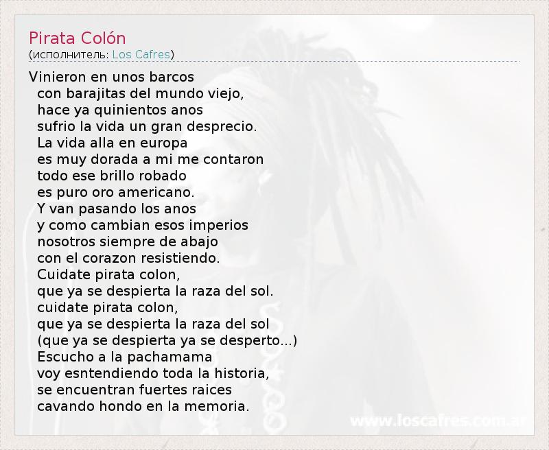 Vinieron en unos barcos con barajitas del mundo viejo, hace ya quinientos anos sufrio la vida un gran desprecio. La vida alla en europa es muy dorada a mi me contaron todo ese brillo robado es puro oro americano. Y van pasando los anos y como cambian esos imperios nosotros siempre de abajo con el corazon resistiendo. Cuidate pirata colon, que ya se despierta la raza del sol. cuidate pirata colon, que ya se despierta la raza del sol (que ya se despierta ya se desperto...) Escucho a la pachamama voy esntendiendo toda la historia, se encuentran fuertes raices cavando hondo en la memoria.