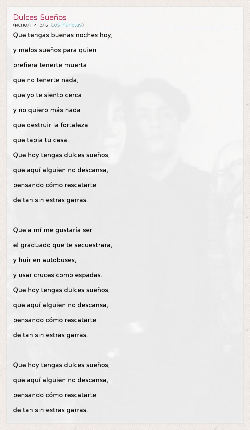 Que tengas buenas noches hoy, y malos sueños para quien prefiera tenerte muerta que no tenerte nada, que yo te siento cerca y no quiero más nada que destruir la fortaleza que tapia tu casa. Que hoy tengas dulces sueños, que aquí alguien no descansa, pensando cómo rescatarte de tan siniestras garras. Que a mí me gustaría ser el graduado que te secuestrara, y huir en autobuses, y usar cruces como espadas. Que hoy tengas dulces sueños, que aquí alguien no descansa, pensando cómo rescatarte de tan siniestras garras. Que hoy tengas dulces sueños, que aquí alguien no descansa, pensando cómo rescatarte de tan siniestras garras.