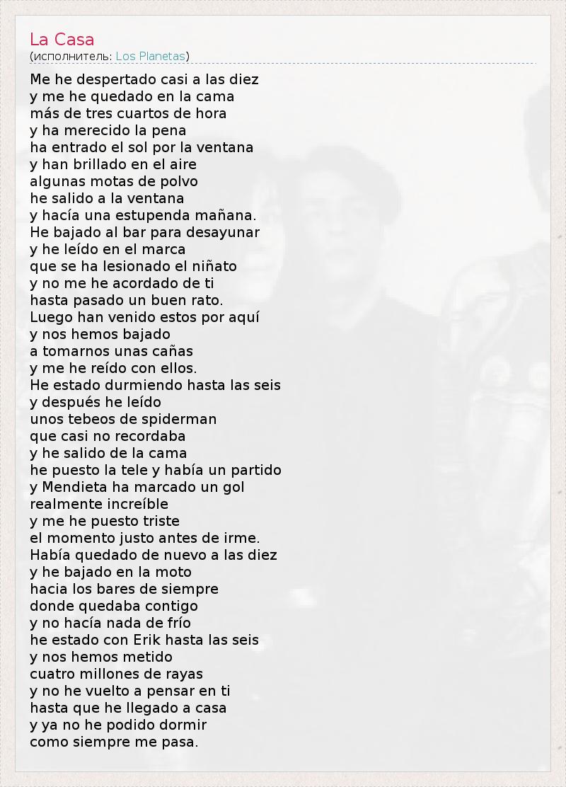 Это интересно:Испанская инди-рок группа «Los Planetas» (Планеты) была основана в 1993г. в Гранаде. Состав группы несколько раз менялся, сегодня в коллектив входят вокалист/гитарист Juan Ramón Rodríguez Cervilla, гитарист Florentino Muñoz Lozano, барабанщик Ernesto Jiménez Linares, клавишник Esteban Fraile Maldonado и басист Julián Méndez Podadera. Первым хитом «Los Planetas» стала песня «Qué puedo hacer» из дебютного альбома исполнителей «Super 8», записанного на студии «RCA-BMG... продолжение