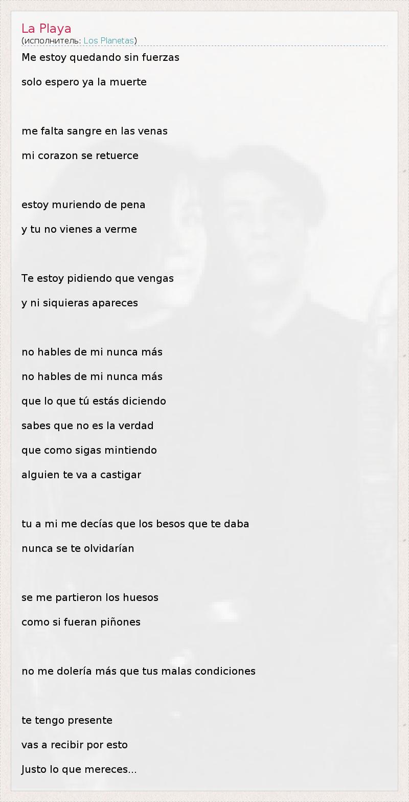 Me estoy quedando sin fuerzas solo espero ya la muerte me falta sangre en las venas mi corazon se retuerce estoy muriendo de pena y tu no vienes a verme Te estoy pidiendo que vengas y ni siquieras apareces no hables de mi nunca más no hables de mi nunca más que lo que tú estás diciendo sabes que no es la verdad que como sigas mintiendo alguien te va a castigar tu a mi me decías que los besos que te daba nunca se te olvidarían se me partieron los huesos como si fueran piñones no me dolería más que tus malas condiciones te tengo presente vas a recibir por esto Justo lo que mereces...