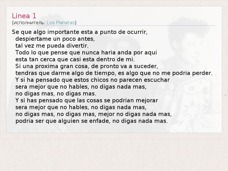 Это интересно:Испанская инди-рок группа «Los Planetas» (Планеты) была основана в 1993г. в Гранаде. Состав группы несколько раз менялся, сегодня в коллектив входят вокалист/гитарист Juan Ramón Rodríguez Cervilla, гитарист Florentino Muñoz Lozano, барабанщик Ernesto Jiménez Linares, клавишник Esteban Fraile Maldonado и басист Julián Méndez Podadera. Первым хитом «Los Planetas» стала песня «Qué puedo hacer» из дебютного альбома исполнителей «Super 8», записанного на студии «RCA-BMG... продолжение