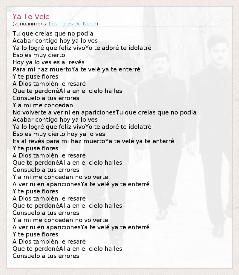 Tu que creías que no podía Acabar contigo hoy ya lo ves Ya lo logré que feliz vivoYo te adoré te idolatré Eso es muy cierto Hoy ya lo ves es al revés Para mi haz muertoYa te velé ya te enterré Y te puse flores A Dios también le resaré Que te perdonéAlla en el cielo halles Consuelo a tus errores Y a mi me concedan No volverte a ver ni en aparicionesTu que creías que no podía Acabar contigo hoy ya lo ves Ya lo logré que feliz vivoYo te adoré te idolatré Eso es muy cierto hoy ya lo ves Es al revés para mi haz muertoYa te velé ya te enterré Y te puse flores A Dios también le resaré Que te perdonéAlla en el cielo halles Consuelo a tus errores Y a mi me concedan no volverte A ver ni en aparicionesYa te velé ya te enterré Y te puse flores A Dios también le resaré Que te perdonéAlla en el cielo halles Consuelo a tus errores Y a mi me concedan no volverte A ver ni en aparicionesYa te velé ya te enterré Y te puse flores A Dios también le resaré Que te perdonéAlla en el cielo halles Consuelo a tus errores