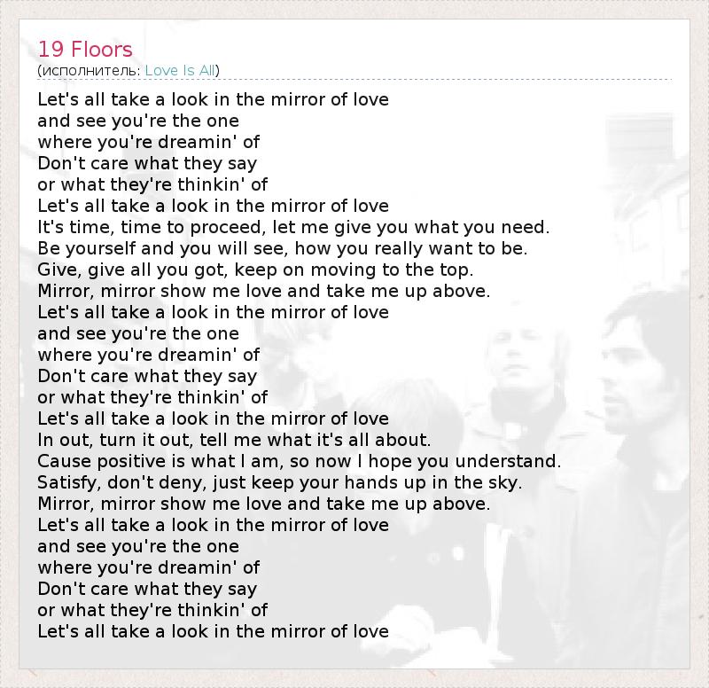 Let's all take a look in the mirror of love and see you're the one where you're dreamin' of Don't care what they say or what they're thinkin' of Let's all take a look in the mirror of love It's time, time to proceed, let me give you what you need. Be yourself and you will see, how you really want to be. Give, give all you got, keep on moving to the top. Mirror, mirror show me love and take me up above. Let's all take a look in the mirror of love and see you're the one where you're dreamin' of Don't care what they say or what they're thinkin' of Let's all take a look in the mirror of love In out, turn it out, tell me what it's all about. Cause positive is what I am, so now I hope you understand. Satisfy, don't deny, just keep your hands up in the sky. Mirror, mirror show me love and take me up above. Let's all take a look in the mirror of love and see you're the one where you're dreamin' of Don't care what they say or what they're thinkin' of Let's all take a look in the mirror of love