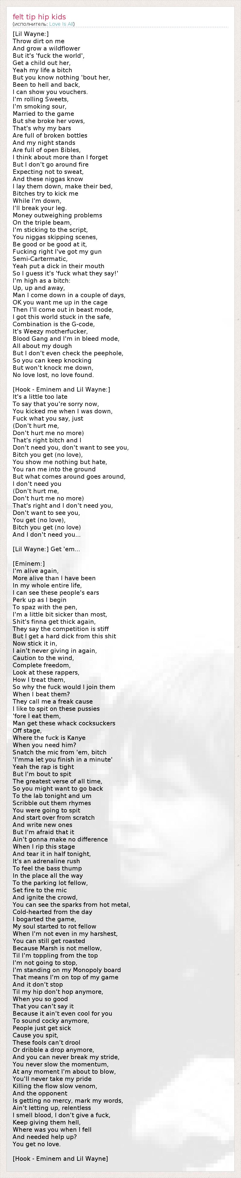[Lil Wayne:] Throw dirt on me And grow a wildflower But it's 'fuck the world', Get a child out her, Yeah my life a bitch But you know nothing 'bout her, Been to hell and back, I can show you vouchers. I'm rolling Sweets, I'm smoking sour, Married to the game But she broke her vows, That's why my bars Are full of broken bottles And my night stands Are full of open Bibles, I think about more than I forget But I don't go around fire Expecting not to sweat, And these niggas know I lay them down, make their bed, Bitches try to kick me While I'm down, I'll break your leg. Money outweighing problems On the triple beam, I'm sticking to the script, You niggas skipping scenes, Be good or be good at it, Fucking right I've got my gun Semi-Cartermatic, Yeah put a dick in their mouth So I guess it's 'fuck what they say!' I'm high as a bitch: Up, up and away, Man I come down in a couple of days, OK you want me up in the cage Then I'll come out in beast mode, I got this world stuck in the safe, Combination is the G-code, It's Weezy motherfucker, Blood Gang and I'm in bleed mode, All about my dough But I don't even check the peephole, So you can keep knocking But won't knock me down, No love lost, no love found. [Hook - Eminem and Lil Wayne:] It's a little too late To say that you're sorry now, You kicked me when I was down, Fuck what you say, just (Don't hurt me, Don't hurt me no more) That's right bitch and I Don't need you, don't want to see you, Bitch you get (no love), You show me nothing but hate, You ran me into the ground But what comes around goes around, I don't need you (Don't hurt me, Don't hurt me no more) That's right and I don't need you, Don't want to see you, You get (no love), Bitch you get (no love) And I don't need you... [Lil Wayne:] Get 'em... [Eminem:] I'm alive again, More alive than I have been In my whole entire life, I can see these people's ears Perk up as I begin To spaz with the pen, I'm a little bit sicker than most, Shit's finna get thick again, They say the competition is stiff But I get a hard dick from this shit Now stick it in, I ain't never giving in again, Caution to the wind, Complete freedom, Look at these rappers, How I treat them, So why the fuck would I join them When I beat them? They call me a freak cause I like to spit on these pussies 'fore I eat them, Man get these whack cocksuckers Off stage, Where the fuck is Kanye When you need him? Snatch the mic from 'em, bitch 'I'mma let you finish in a minute' Yeah the rap is tight But I'm bout to spit The greatest verse of all time, So you might want to go back To the lab tonight and um Scribble out them rhymes You were going to spit And start over from scratch And write new ones But I'm afraid that it Ain't gonna make no difference When I rip this stage And tear it in half tonight, It's an adrenaline rush To feel the bass thump In the place all the way To the parking lot fellow, Set fire to the mic And ignite the crowd, You can see the sparks from hot metal, Cold-hearted from the day I bogarted the game, My soul started to rot fellow When I'm not even in my harshest, You can still get roasted Because Marsh is not mellow, Til I'm toppling from the top I'm not going to stop, I'm standing on my Monopoly board That means I'm on top of my game And it don't stop Til my hip don't hop anymore, When you so good That you can't say it Because it ain't even cool for you To sound cocky anymore, People just get sick Cause you spit, These fools can't drool Or dribble a drop anymore, And you can never break my stride, You never slow the momentum, At any moment I'm about to blow, You'll never take my pride Killing the flow slow venom, And the opponent Is getting no mercy, mark my words, Ain't letting up, relentless I smell blood, I don't give a fuck, Keep giving them hell, Where was you when I fell And needed help up? You get no love. [Hook - Eminem and Lil Wayne]