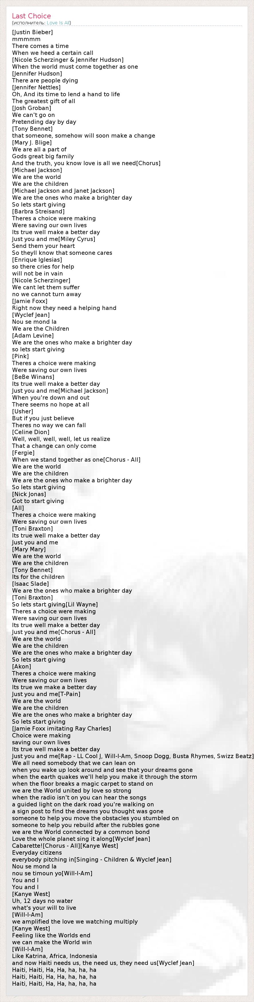 [Justin Bieber] mmmmm There comes a time When we heed a certain call [Nicole Scherzinger & Jennifer Hudson] When the world must come together as one [Jennifer Hudson] There are people dying [Jennifer Nettles] Oh, And its time to lend a hand to life The greatest gift of all [Josh Groban] We can't go on Pretending day by day [Tony Bennet] that someone, somehow will soon make a change [Mary J. Blige] We are all a part of Gods great big family And the truth, you know love is all we need[Chorus] [Michael Jackson] We are the world We are the children [Michael Jackson and Janet Jackson] We are the ones who make a brighter day So lets start giving [Barbra Streisand] Theres a choice were making Were saving our own lives Its true well make a better day Just you and me[Miley Cyrus] Send them your heart So theyll know that someone cares [Enrique Iglesias] so there cries for help will not be in vain [Nicole Scherzinger] We cant let them suffer no we cannot turn away [Jamie Foxx] Right now they need a helping hand [Wyclef Jean] Nou se mond la We are the Children [Adam Levine] We are the ones who make a brighter day so lets start giving [Pink] Theres a choice were making Were saving our own lives [BeBe Winans] Its true well make a better day Just you and me[Michael Jackson] When you're down and out There seems no hope at all [Usher] But if you just believe Theres no way we can fall [Celine Dion] Well, well, well, well, let us realize That a change can only come [Fergie] When we stand together as one[Chorus - All] We are the world We are the children We are the ones who make a brighter day So lets start giving [Nick Jonas] Got to start giving [All] Theres a choice were making Were saving our own lives [Toni Braxton] Its true well make a better day Just you and me [Mary Mary] We are the world We are the children [Tony Bennet] Its for the children [Isaac Slade] We are the ones who make a brighter day [Toni Braxton] So lets start giving[Lil Wayne] Theres a choice were making Were saving our own lives Its true well make a better day Just you and me[Chorus - All] We are the world We are the children We are the ones who make a brighter day So lets start giving [Akon] Theres a choice were making Were saving our own lives Its true we make a better day Just you and me[T-Pain] We are the world We are the children We are the ones who make a brighter day So lets start giving [Jamie Foxx imitating Ray Charles] Choice were making saving our own lives Its true well make a better day Just you and me[Rap - LL Cool J, Will-I-Am, Snoop Dogg, Busta Rhymes, Swizz Beatz] We all need somebody that we can lean on when you wake up look around and see that your dreams gone when the earth quakes we'll help you make it through the storm when the floor breaks a magic carpet to stand on we are the World united by love so strong when the radio isn't on you can hear the songs a guided light on the dark road you're walking on a sign post to find the dreams you thought was gone someone to help you move the obstacles you stumbled on someone to help you rebuild after the rubbles gone we are the World connected by a common bond Love the whole planet sing it along[Wyclef Jean] Cabarette![Chorus - All][Kanye West] Everyday citizens everybody pitching in[Singing - Children & Wyclef Jean] Nou se mond la nou se timoun yo[Will-I-Am] You and I You and I [Kanye West] Uh, 12 days no water what's your will to live [Will-I-Am] we amplified the love we watching multiply [Kanye West] Feeling like the Worlds end we can make the World win [Will-I-Am] Like Katrina, Africa, Indonesia and now Haiti needs us, the need us, they need us[Wyclef Jean] Haiti, Haiti, Ha, Ha, ha, ha, ha Haiti, Haiti, Ha, Ha, ha, ha, ha Haiti, Haiti, Ha, Ha, ha, ha, ha