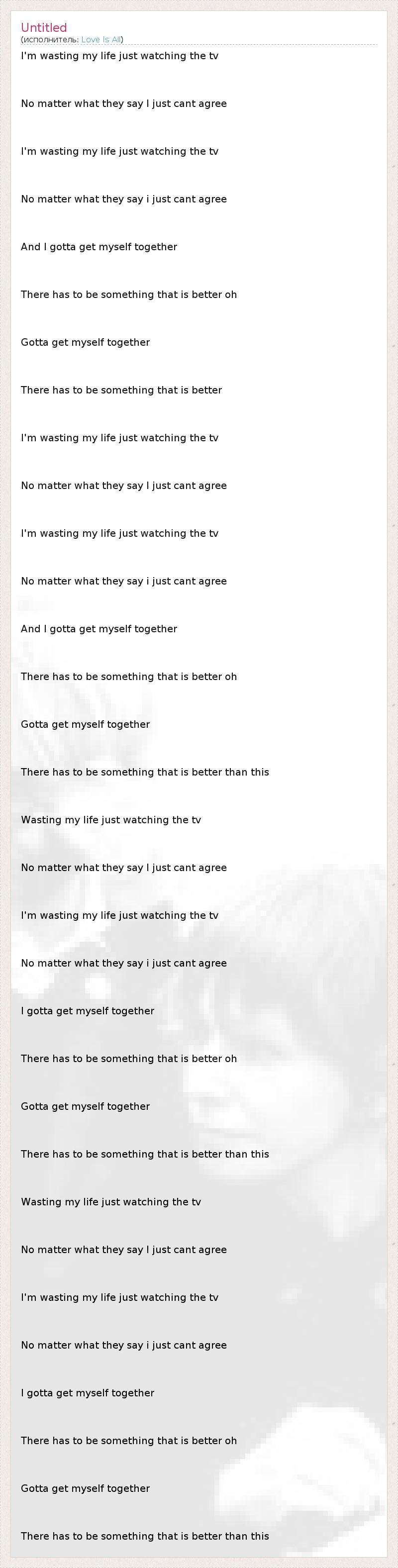 I'm wasting my life just watching the tv No matter what they say I just cant agree I'm wasting my life just watching the tv No matter what they say i just cant agree And I gotta get myself together There has to be something that is better oh Gotta get myself together There has to be something that is better I'm wasting my life just watching the tv No matter what they say I just cant agree I'm wasting my life just watching the tv No matter what they say i just cant agree And I gotta get myself together There has to be something that is better oh Gotta get myself together There has to be something that is better than this Wasting my life just watching the tv No matter what they say I just cant agree I'm wasting my life just watching the tv No matter what they say i just cant agree I gotta get myself together There has to be something that is better oh Gotta get myself together There has to be something that is better than this Wasting my life just watching the tv No matter what they say I just cant agree I'm wasting my life just watching the tv No matter what they say i just cant agree I gotta get myself together There has to be something that is better oh Gotta get myself together There has to be something that is better than this