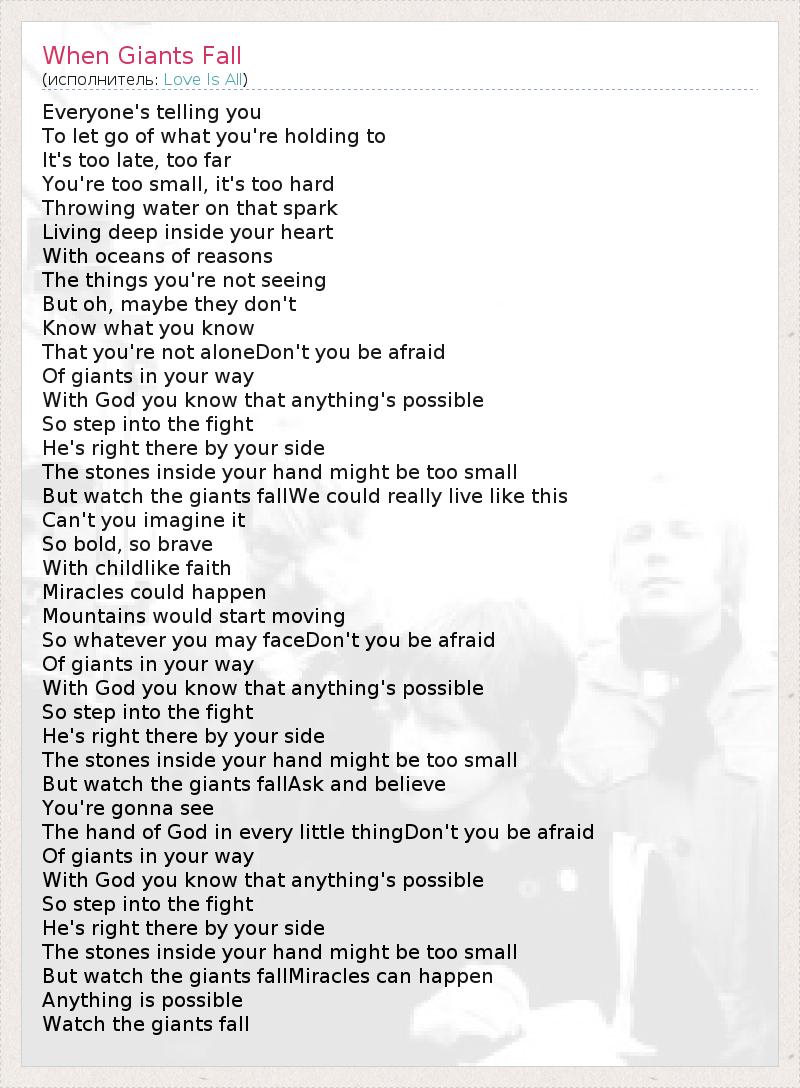 Everyone's telling you To let go of what you're holding to It's too late, too far You're too small, it's too hard Throwing water on that spark Living deep inside your heart With oceans of reasons The things you're not seeing But oh, maybe they don't Know what you know That you're not aloneDon't you be afraid Of giants in your way With God you know that anything's possible So step into the fight He's right there by your side The stones inside your hand might be too small But watch the giants fallWe could really live like this Can't you imagine it So bold, so brave With childlike faith Miracles could happen Mountains would start moving So whatever you may faceDon't you be afraid Of giants in your way With God you know that anything's possible So step into the fight He's right there by your side The stones inside your hand might be too small But watch the giants fallAsk and believe You're gonna see The hand of God in every little thingDon't you be afraid Of giants in your way With God you know that anything's possible So step into the fight He's right there by your side The stones inside your hand might be too small But watch the giants fallMiracles can happen Anything is possible Watch the giants fall