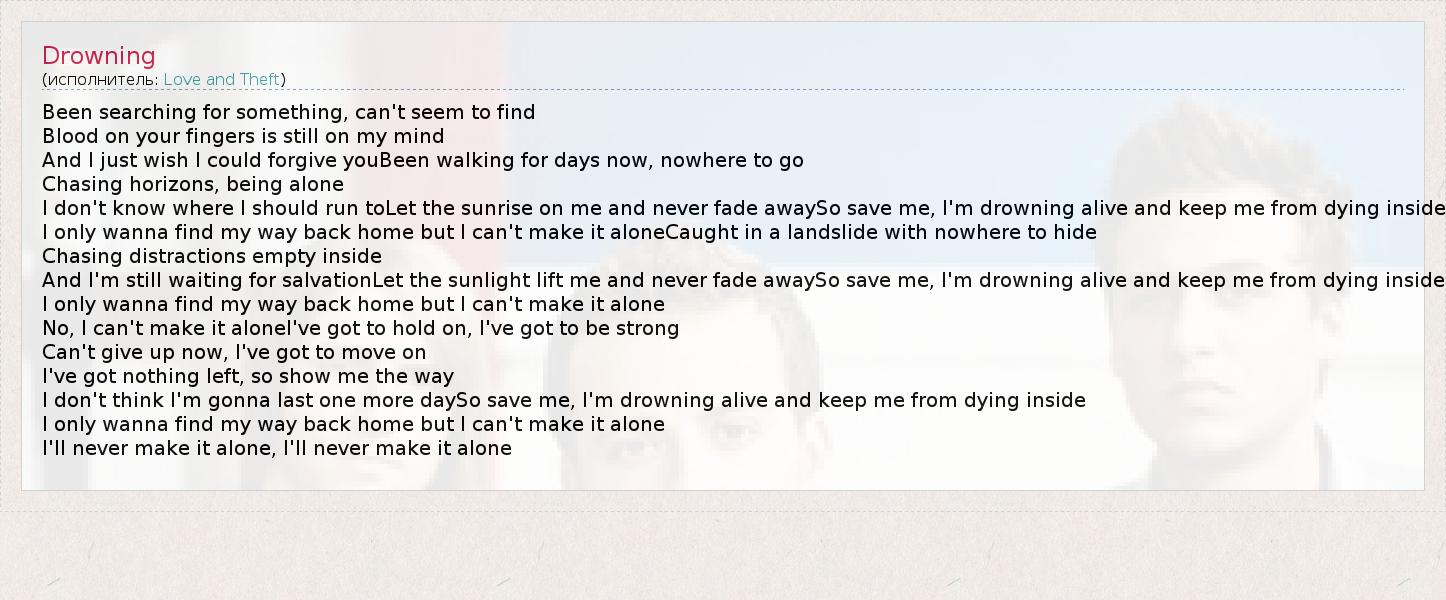 Been searching for something, can't seem to find Blood on your fingers is still on my mind And I just wish I could forgive youBeen walking for days now, nowhere to go Chasing horizons, being alone I don't know where I should run toLet the sunrise on me and never fade awaySo save me, I'm drowning alive and keep me from dying inside I only wanna find my way back home but I can't make it aloneCaught in a landslide with nowhere to hide Chasing distractions empty inside And I'm still waiting for salvationLet the sunlight lift me and never fade awaySo save me, I'm drowning alive and keep me from dying inside I only wanna find my way back home but I can't make it alone No, I can't make it aloneI've got to hold on, I've got to be strong Can't give up now, I've got to move on I've got nothing left, so show me the way I don't think I'm gonna last one more daySo save me, I'm drowning alive and keep me from dying inside I only wanna find my way back home but I can't make it alone I'll never make it alone, I'll never make it alone