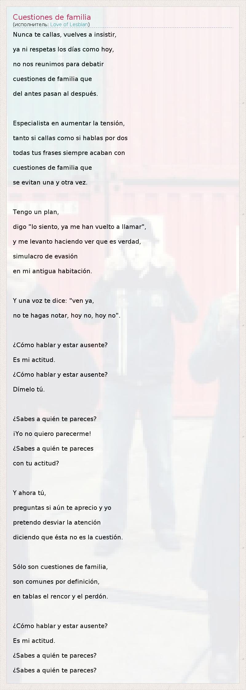 Nunca te callas, vuelves a insistir, ya ni respetas los días como hoy, no nos reunimos para debatir cuestiones de familia que del antes pasan al después. Especialista en aumentar la tensión, tanto si callas como si hablas por dos todas tus frases siempre acaban con cuestiones de familia que se evitan una y otra vez. Tengo un plan, digo "lo siento, ya me han vuelto a llamar", y me levanto haciendo ver que es verdad, simulacro de evasión en mi antigua habitación. Y una voz te dice: "ven ya, no te hagas notar, hoy no, hoy no". ¿Cómo hablar y estar ausente? Es mi actitud. ¿Cómo hablar y estar ausente? Dímelo tú. ¿Sabes a quién te pareces? ¡Yo no quiero parecerme! ¿Sabes a quién te pareces con tu actitud? Y ahora tú, preguntas si aún te aprecio y yo pretendo desviar la atención diciendo que ésta no es la cuestión. Sólo son cuestiones de familia, son comunes por definición, en tablas el rencor y el perdón. ¿Cómo hablar y estar ausente? Es mi actitud. ¿Sabes a quién te pareces? ¿Sabes a quién te pareces?