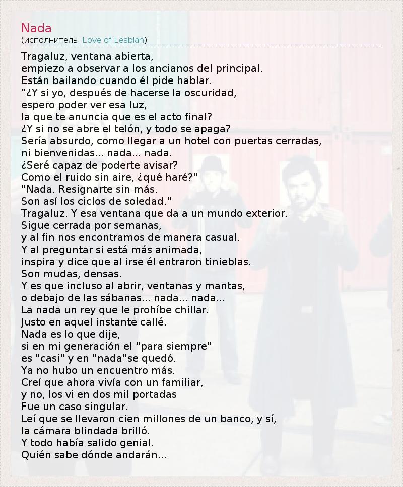 Это интересно:Love of Lesbian - испанская группа, исполняющая музыку в стиле поп-рок, инди-поп. Была образована в Барселоне в 1996 году. Первый выпущенный альбом - "Microscopic Movies", 1999 год. Члены группы - Santi Balmes, Julián Saldarriaga, Jordi Roig, Joan Ramon Planell, Oriol Bonet.После трех дисков, выпущенных на английском языке, Love of Lesbian решили исполнять песни на испанском, вследствие чего выпустили свои последние три диска на кастельяно.... продолжение