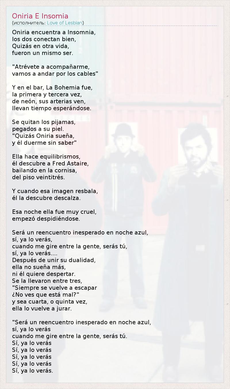 Это интересно:Love of Lesbian - испанская группа, исполняющая музыку в стиле поп-рок, инди-поп. Была образована в Барселоне в 1996 году. Первый выпущенный альбом - "Microscopic Movies", 1999 год. Члены группы - Santi Balmes, Julián Saldarriaga, Jordi Roig, Joan Ramon Planell, Oriol Bonet.После трех дисков, выпущенных на английском языке, Love of Lesbian решили исполнять песни на испанском, вследствие чего выпустили свои последние три диска на кастельяно.... продолжение