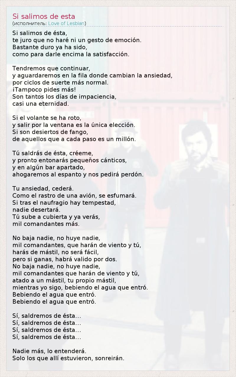 Si salimos de ésta, te juro que no haré ni un gesto de emoción. Bastante duro ya ha sido, como para darle encima la satisfacción. Tendremos que continuar, y aguardaremos en la fila donde cambian la ansiedad, por ciclos de suerte más normal. ¡Tampoco pides más! Son tantos los días de impaciencia, casi una eternidad. Si el volante se ha roto, y salir por la ventana es la única elección. Si son desiertos de fango, de aquellos que a cada paso es un millón. Tú saldrás de ésta, créeme, y pronto entonarás pequeños cánticos, y en algún bar apartado, ahogaremos al espanto y nos pedirá perdón. Tu ansiedad, cederá. Como el rastro de una avión, se esfumará. Si tras el naufragio hay tempestad, nadie desertará. Tú sube a cubierta y ya verás, mil comandantes más. No baja nadie, no huye nadie, mil comandantes, que harán de viento y tú, harás de mástil, no será fácil, pero si ganas, habrá valido por dos. No baja nadie, no huye nadie, mil comandantes que harán de viento y tú, atado a un mástil, tu propio mástil, mientras yo sigo, bebiendo el agua que entró. Bebiendo el agua que entró. Bebiendo el agua que entró. Sí, saldremos de ésta… Sí, saldremos de ésta… Sí, saldremos de ésta… Sí, saldremos de ésta… Nadie más, lo entenderá. Solo los que allí estuvieron, sonreirán.