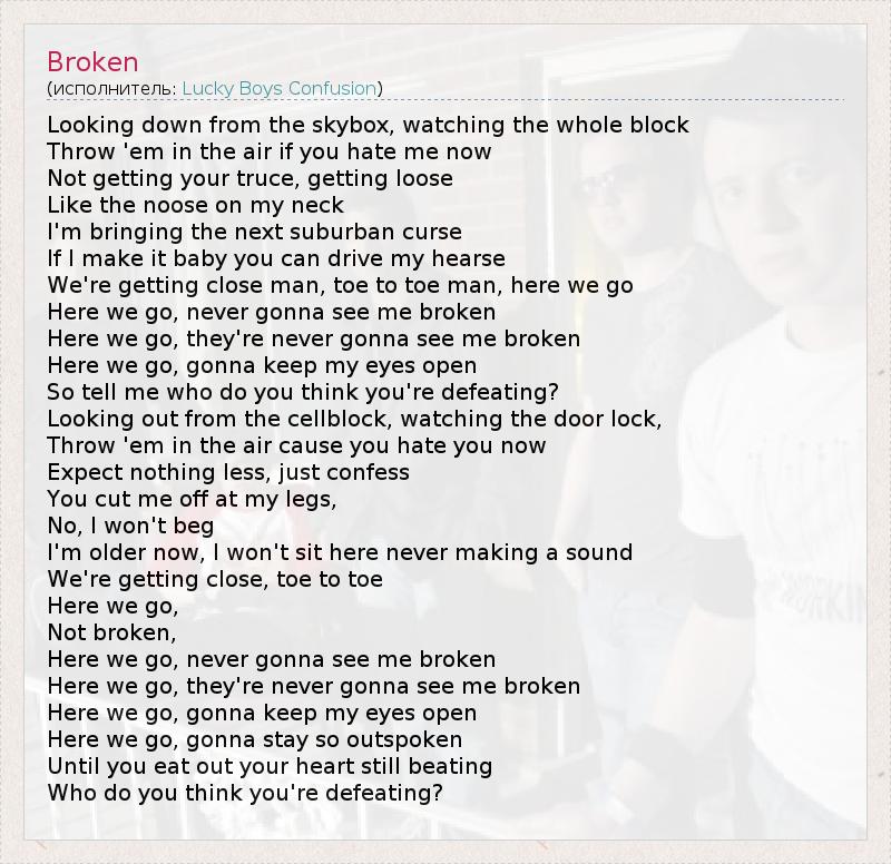 Looking down from the skybox, watching the whole block Throw 'em in the air if you hate me now Not getting your truce, getting loose Like the noose on my neck I'm bringing the next suburban curse If I make it baby you can drive my hearse We're getting close man, toe to toe man, here we go Here we go, never gonna see me broken Here we go, they're never gonna see me broken Here we go, gonna keep my eyes open So tell me who do you think you're defeating? Looking out from the cellblock, watching the door lock, Throw 'em in the air cause you hate you now Expect nothing less, just confess You cut me off at my legs, No, I won't beg I'm older now, I won't sit here never making a sound We're getting close, toe to toe Here we go, Not broken, Here we go, never gonna see me broken Here we go, they're never gonna see me broken Here we go, gonna keep my eyes open Here we go, gonna stay so outspoken Until you eat out your heart still beating Who do you think you're defeating?