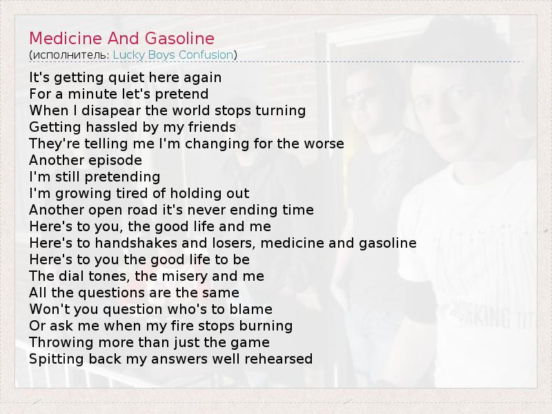 А как ты думаешь, о чем песня "Medicine And Gasoline" ?