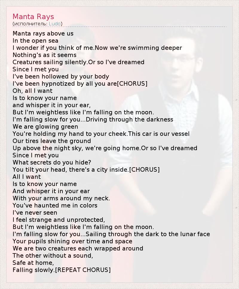 Manta rays above us In the open sea I wonder if you think of me.Now we're swimming deeper Nothing's as it seems Creatures sailing silently.Or so I've dreamed Since I met you I've been hollowed by your body I've been hypnotized by all you are[CHORUS] Oh, all I want Is to know your name and whisper it in your ear, But I'm weightless like I'm falling on the moon. I'm falling slow for you...Driving through the darkness We are glowing green You're holding my hand to your cheek.This car is our vessel Our tires leave the ground Up above the night sky, we're going home.Or so I've dreamed Since I met you What secrets do you hide? You tilt your head, there's a city inside.[CHORUS] All I want Is to know your name And whisper it in your ear With your arms around my neck. You've haunted me in colors I've never seen I feel strange and unprotected, But I'm weightless like I'm falling on the moon. I'm falling slow for you...Sailing through the dark to the lunar face Your pupils shining over time and space We are two creatures each wrapped around The other without a sound, Safe at home, Falling slowly.[REPEAT CHORUS]