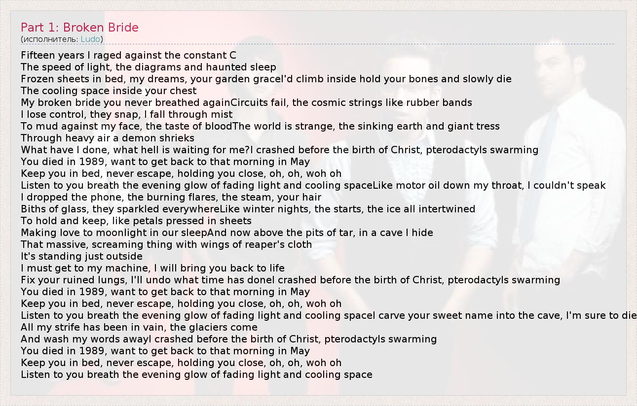 А как ты думаешь, о чем песня "Part 1: Broken Bride" ?