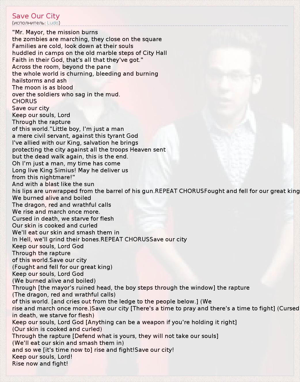 "Mr. Mayor, the mission burns the zombies are marching, they close on the square Families are cold, look down at their souls huddled in camps on the old marble steps of City Hall Faith in their God, that's all that they've got." Across the room, beyond the pane the whole world is churning, bleeding and burning hailstorms and ash The moon is as blood over the soldiers who sag in the mud. CHORUS Save our city Keep our souls, Lord Through the rapture of this world."Little boy, I'm just a man a mere civil servant, against this tyrant God I've allied with our King, salvation he brings protecting the city against all the troops Heaven sent but the dead walk again, this is the end. Oh I'm just a man, my time has come Long live King Simius! May he deliver us from this nightmare!" And with a blast like the sun his lips are unwrapped from the barrel of his gun.REPEAT CHORUSFought and fell for our great king We burned alive and boiled The dragon, red and wrathful calls We rise and march once more. Cursed in death, we starve for flesh Our skin is cooked and curled We'll eat our skin and smash them in In Hell, we'll grind their bones.REPEAT CHORUSSave our city Keep our souls, Lord God Through the rapture of this world.Save our city (Fought and fell for our great king) Keep our souls, Lord God (We burned alive and boiled) Through [the mayor's ruined head, the boy steps through the window] the rapture (The dragon, red and wrathful calls) of this world. [and cries out from the ledge to the people below.] (We rise and march once more.)Save our city [There's a time to pray and there's a time to fight] (Cursed in death, we starve for flesh) Keep our souls, Lord God [Anything can be a weapon if you're holding it right] (Our skin is cooked and curled) Through the rapture [Defend what is yours, they will not take our souls] (We'll eat our skin and smash them in) and so we [it's time now to] rise and fight!Save our city! Keep our souls, Lord! Rise now and fight!
