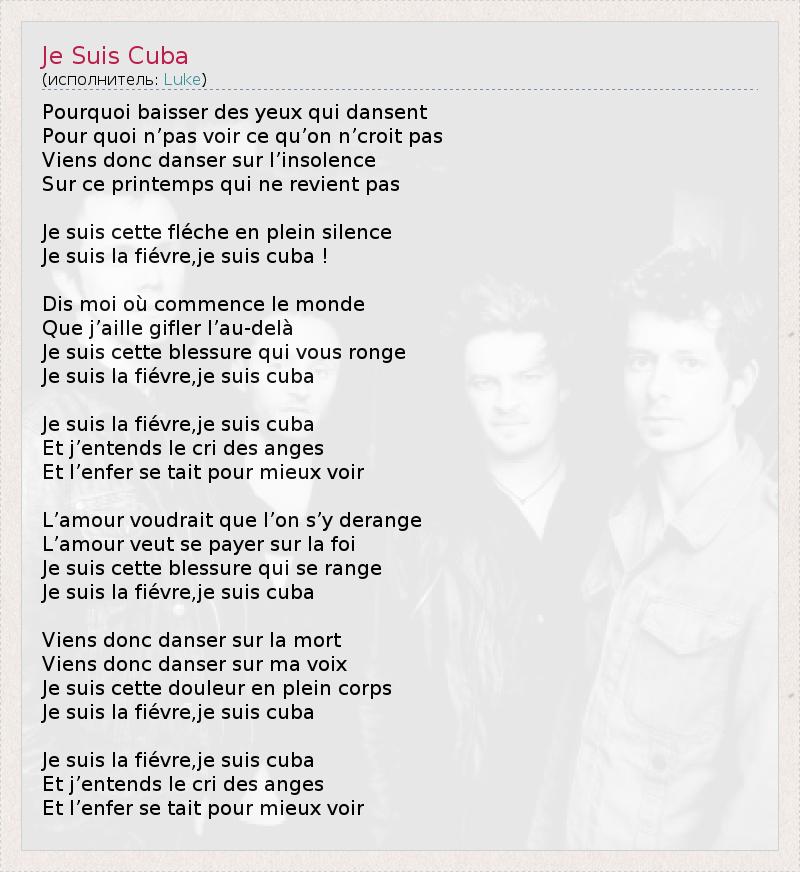 Pourquoi baisser des yeux qui dansent Pour quoi n’pas voir ce qu’on n’croit pas Viens donc danser sur l’insolence Sur ce printemps qui ne revient pas Je suis cette fléche en plein silence Je suis la fiévre,je suis cuba ! Dis moi où commence le monde Que j’aille gifler l’au-delà Je suis cette blessure qui vous ronge Je suis la fiévre,je suis cuba Je suis la fiévre,je suis cuba Et j’entends le cri des anges Et l’enfer se tait pour mieux voir L’amour voudrait que l’on s’y derange L’amour veut se payer sur la foi Je suis cette blessure qui se range Je suis la fiévre,je suis cuba Viens donc danser sur la mort Viens donc danser sur ma voix Je suis cette douleur en plein corps Je suis la fiévre,je suis cuba Je suis la fiévre,je suis cuba Et j’entends le cri des anges Et l’enfer se tait pour mieux voir
