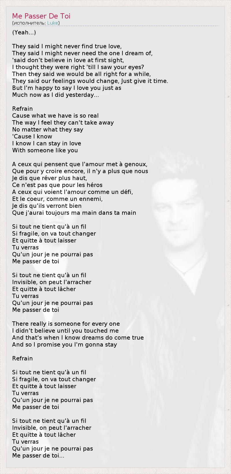 А как ты думаешь, о чем песня "Me Passer De Toi" ?