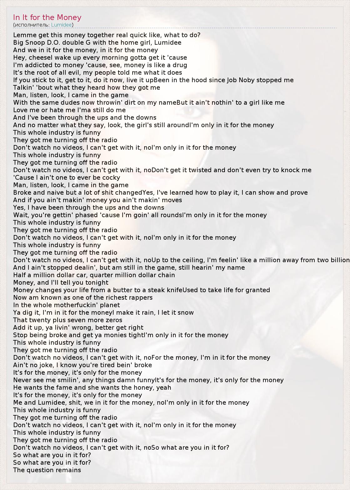 Lemme get this money together real quick like, what to do? Big Snoop D.O. double G with the home girl, Lumidee And we in it for the money, in it for the money Hey, cheeseI wake up every morning gotta get it 'cause I'm addicted to money 'cause, see, money is like a drug It's the root of all evil, my people told me what it does If you stick to it, get to it, do it now, live it upBeen in the hood since Job Noby stopped me Talkin' 'bout what they heard how they got me Man, listen, look, I came in the game With the same dudes now throwin' dirt on my nameBut it ain't nothin' to a girl like me Love me or hate me I'ma still do me And I've been through the ups and the downs And no matter what they say, look, the girl's still aroundI'm only in it for the money This whole industry is funny They got me turning off the radio Don't watch no videos, I can't get with it, noI'm only in it for the money This whole industry is funny They got me turning off the radio Don't watch no videos, I can't get with it, noDon't get it twisted and don't even try to knock me 'Cause I ain't one to ever be cocky Man, listen, look, I came in the game Broke and naive but a lot of shit changedYes, I've learned how to play it, I can show and prove And if you ain't makin' money you ain't makin' moves Yes, I have been through the ups and the downs Wait, you're gettin' phased 'cause I'm goin' all roundsI'm only in it for the money This whole industry is funny They got me turning off the radio Don't watch no videos, I can't get with it, noI'm only in it for the money This whole industry is funny They got me turning off the radio Don't watch no videos, I can't get with it, noUp to the ceiling, I'm feelin' like a million away from two billion And I ain't stopped dealin', but am still in the game, still hearin' my name Half a million dollar car, quarter million dollar chain Money, and I'll tell you tonight Money changes your life from a butter to a steak knifeUsed to take life for granted Now am known as one of the richest rappers In the whole motherfuckin' planet Ya dig it, I'm in it for the moneyI make it rain, I let it snow That twenty plus seven more zeros Add it up, ya livin' wrong, better get right Stop being broke and get ya monies tightI'm only in it for the money This whole industry is funny They got me turning off the radio Don't watch no videos, I can't get with it, noFor the money, I'm in it for the money Ain't no joke, I know you're tired bein' broke It's for the money, it's only for the money Never see me smilin', any things damn funnyIt's for the money, it's only for the money He wants the fame and she wants the honey, yeah It's for the money, it's only for the money Me and Lumidee, shit, we in it for the money, noI'm only in it for the money This whole industry is funny They got me turning off the radio Don't watch no videos, I can't get with it, noI'm only in it for the money This whole industry is funny They got me turning off the radio Don't watch no videos, I can't get with it, noSo what are you in it for? So what are you in it for? So what are you in it for? The question remains