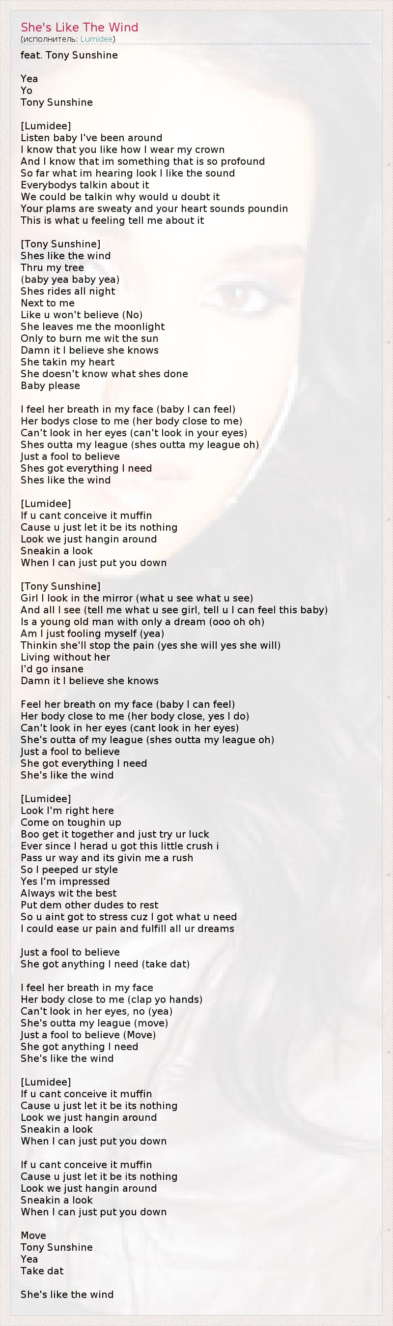 А как ты думаешь, о чем песня "She's Like The Wind" ?