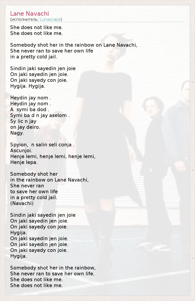 She does not like me. She does not like me. Somebody shot her in the rainbow on Lane Navachi, She never ran to save her own life in a pretty cold jail. Sindin jaki sayedin jen joie On jaki sayedin jen joie. On jaki sayedy con joie. Hygija. Hygija. Heydin jay nom . Heydin jay nom . A symi ba dod . Symi ba d n jay aselom . Sy lic n jay on jay deiro. Nagy. Spyion, n salin seli conja . Ascunjoi. Henje lemi, henje lemi, henje lemi, Henje lepa. Somebody shot her in the rainbow on Lane Navachi, She never ran to save her own life in a pretty cold jail. (Navachi) Sindin jaki sayedin jen joie On jaki sayedin jen joie. On jaki sayedy con joie. Hygija. On jaki sayedin jen joie. On jaki sayedin jen joie. On jaki sayedy con joie. Hygija. Somebody shot her in the rainbow, She never ran to save her own life. She does not like me. She does not like me.