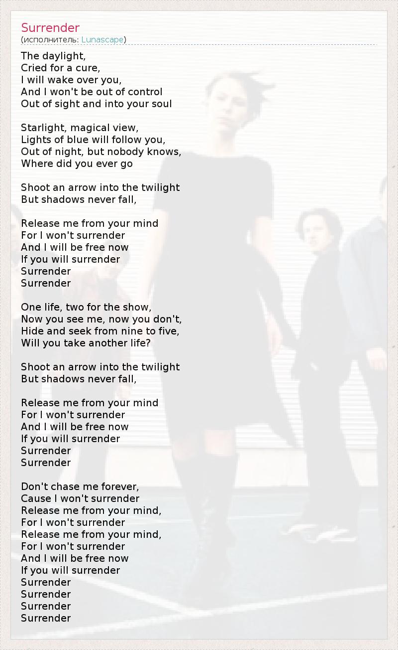 The daylight, Cried for a cure, I will wake over you, And I won't be out of control Out of sight and into your soul Starlight, magical view, Lights of blue will follow you, Out of night, but nobody knows, Where did you ever go Shoot an arrow into the twilight But shadows never fall, Release me from your mind For I won't surrender And I will be free now If you will surrender Surrender Surrender One life, two for the show, Now you see me, now you don't, Hide and seek from nine to five, Will you take another life? Shoot an arrow into the twilight But shadows never fall, Release me from your mind For I won't surrender And I will be free now If you will surrender Surrender Surrender Don't chase me forever, Cause I won't surrender Release me from your mind, For I won't surrender Release me from your mind, For I won't surrender And I will be free now If you will surrender Surrender Surrender Surrender Surrender