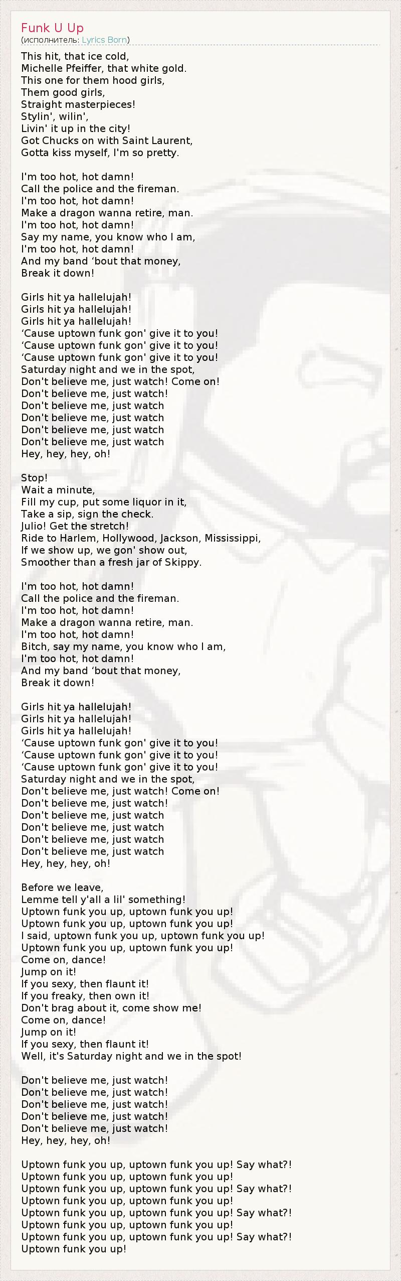 This hit, that ice cold, Michelle Pfeiffer, that white gold. This one for them hood girls, Them good girls, Straight masterpieces! Stylin', wilin', Livin' it up in the city! Got Chucks on with Saint Laurent, Gotta kiss myself, I'm so pretty. I'm too hot, hot damn! Call the police and the fireman. I'm too hot, hot damn! Make a dragon wanna retire, man. I'm too hot, hot damn! Say my name, you know who I am, I'm too hot, hot damn! And my band ‘bout that money, Break it down! Girls hit ya hallelujah! Girls hit ya hallelujah! Girls hit ya hallelujah! ‘Cause uptown funk gon' give it to you! ‘Cause uptown funk gon' give it to you! ‘Cause uptown funk gon' give it to you! Saturday night and we in the spot, Don't believe me, just watch! Come on! Don't believe me, just watch! Don't believe me, just watch Don't believe me, just watch Don't believe me, just watch Don't believe me, just watch Hey, hey, hey, oh! Stop! Wait a minute, Fill my cup, put some liquor in it, Take a sip, sign the check. Julio! Get the stretch! Ride to Harlem, Hollywood, Jackson, Mississippi, If we show up, we gon' show out, Smoother than a fresh jar of Skippy. I'm too hot, hot damn! Call the police and the fireman. I'm too hot, hot damn! Make a dragon wanna retire, man. I'm too hot, hot damn! Bitch, say my name, you know who I am, I'm too hot, hot damn! And my band ‘bout that money, Break it down! Girls hit ya hallelujah! Girls hit ya hallelujah! Girls hit ya hallelujah! ‘Cause uptown funk gon' give it to you! ‘Cause uptown funk gon' give it to you! ‘Cause uptown funk gon' give it to you! Saturday night and we in the spot, Don't believe me, just watch! Come on! Don't believe me, just watch! Don't believe me, just watch Don't believe me, just watch Don't believe me, just watch Don't believe me, just watch Hey, hey, hey, oh! Before we leave, Lemme tell y'all a lil' something! Uptown funk you up, uptown funk you up! Uptown funk you up, uptown funk you up! I said, uptown funk you up, uptown funk you up! Uptown funk you up, uptown funk you up! Come on, dance! Jump on it! If you sexy, then flaunt it! If you freaky, then own it! Don't brag about it, come show me! Come on, dance! Jump on it! If you sexy, then flaunt it! Well, it's Saturday night and we in the spot! Don't believe me, just watch! Don't believe me, just watch! Don't believe me, just watch! Don't believe me, just watch! Don't believe me, just watch! Hey, hey, hey, oh! Uptown funk you up, uptown funk you up! Say what?! Uptown funk you up, uptown funk you up! Uptown funk you up, uptown funk you up! Say what?! Uptown funk you up, uptown funk you up! Uptown funk you up, uptown funk you up! Say what?! Uptown funk you up, uptown funk you up! Uptown funk you up, uptown funk you up! Say what?! Uptown funk you up!
