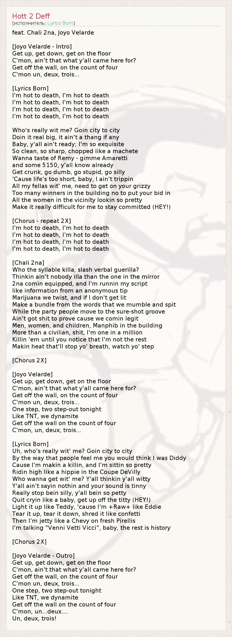 feat. Chali 2na, Joyo Velarde [Joyo Velarde - Intro] Get up, get down, get on the floor C'mon, ain't that what y'all came here for? Get off the wall, on the count of four C'mon un, deux, trois... [Lyrics Born] I'm hot to death, I'm hot to death I'm hot to death, I'm hot to death I'm hot to death, I'm hot to death I'm hot to death, I'm hot to death Who's really wit me? Goin city to city Doin it real big, it ain't a thang if any Baby, y'all ain't ready; I'm so exquisite So clean, so sharp, chopped like a machete Wanna taste of Remy - gimme Amaretti and some 5150, y'all know already Get crunk, go dumb, go stupid, go silly 'Cause life's too short, baby, I ain't trippin All my fellas wit' me, need to get on your grizzy Too many winners in the building no to put your bid in All the women in the vicinity lookin so pretty Make it really difficult for me to stay committed (HEY!) [Chorus - repeat 2X] I'm hot to death, I'm hot to death I'm hot to death, I'm hot to death I'm hot to death, I'm hot to death I'm hot to death, I'm hot to death [Chali 2na] Who the syllable killa, slash verbal guerilla? Thinkin ain't nobody illa than the one in the mirror 2na comin equipped, and I'm runnin my script like information from an anonymous tip Marijuana we twist, and if I don't get lit Make a bundle from the words that we mumble and spit While the party people move to the sure-shot groove Ain't got shit to prove cause we comin legit Men, women, and children, Manphib in the building More than a civilian, shit, I'm one in a million Killin 'em until you notice that I'm not the rest Makin heat that'll stop yo' breath, watch yo' step [Chorus 2X] [Joyo Velarde] Get up, get down, get on the floor C'mon, ain't that what y'all came here for? Get off the wall, on the count of four C'mon un, deux, trois... One step, two step-out tonight Like TNT, we dynamite Get off the wall on the count of four C'mon, un, deux, trois... [Lyrics Born] Uh, who's really wit' me? Goin city to city By the way that people feel me you would think I was Diddy Cause I'm makin a killin, and I'm sittin so pretty Ridin high like a hippie in the Coupe DeVilly Who wanna get wit' me? Y'all thinkin y'all witty Y'all ain't sayin nothin and your sound is tinny Really stop bein silly, y'all bein so petty Quit cryin like a baby, get up off the titty (HEY!) Light it up like Teddy, 'cause I'm +Raw+ like Eddie Tear it up, tear it down, shred it like confetti Then I'm jetty like a Chevy on fresh Pirellis I'm talking "Venni Vetti Vicci", baby, the rest is history [Chorus 2X] [Joyo Velarde - Outro] Get up, get down, get on the floor C'mon, ain't that what y'all came here for? Get off the wall, on the count of four C'mon un, deux, trois... One step, two step-out tonight Like TNT, we dynamite Get off the wall on the count of four C'mon, un...deux.... Un, deux, trois!