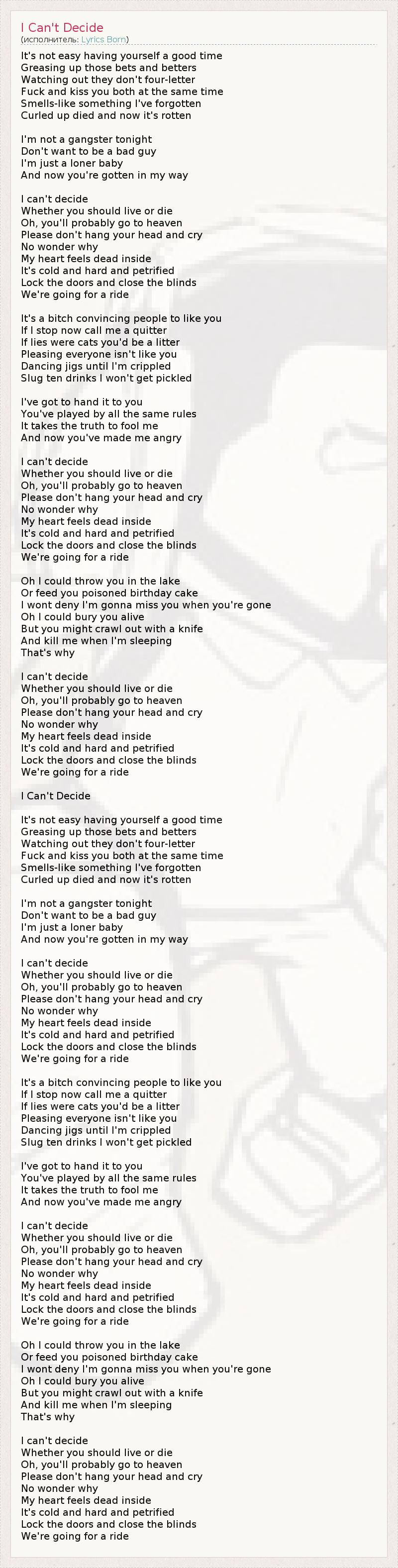Так непросто хорошо развлекаться. Так стараться, лезть из кожи, Думать, будто не поможет. Сразу же с двумя целоваться. Пахнет как-то так забыто, Умерло, сгнило, зарыто. Сегодня я не гангстер, Не буду злым и строгим, Я просто одинокий, И ты встал на дороге. Как мне решить, Жить тебе или не жить? Ты, наверно, сразу в рай. Так что сильно не рыдай. Плевать, Что сердце зло и холодно. Как будто умерло оно. Дверь закрой, зашторь окно, Проедемся с тобой. Бесит ждать, чтобы тебя все любили. Брошу - слабаком зови, Ложь в своей крови носи. Угождать всем не в твоём стиле. До упаду быть на танцах, Не пьянея, напиваться. Согласен, что ты круче. Держался тех же правил. Меня ты одурачил, Разгневаться заставил. Как мне решить, Жить тебе или не жить? Ты, наверно, сразу в рай. Так что сильно не рыдай. Плевать, Что сердце зло и холодно. Как будто умерло оно. Дверь закрой, зашторь окно, Проедемся с тобой. Могу столкнуть тебя за борт, Подсунуть ядовитый торт, Не скрою, буду по тебе потом скучать. Могу зарыть тебя живьём, Но ты же вылезешь с ножом, Убьёшь меня в постели, Так что... Как мне решить, Жить тебе или не жить? Ты, наверно, сразу в рай. Так что сильно не рыдай. Плевать, Что сердце зло и холодно. Как будто умерло оно. Дверь закрой, зашторь окно, Проедемся с тобой. Я не могу решать (перевод nociveиз Москвы) Не так-то легко хорошо повеселиться: Умасливать всех воротил, Следить, чтобы все вели себя прилично, Одновременно целовать и посылать тебя к черту – Это развлечения из далекого прошлого, Испорченные, мертвые и дурно пахнущие. Я не разбойник, И не хочу быть плохим парнем. Я одинок и несчастен, А ты просто попалась мне на пути. Я не могу решать, Жить тебе или умереть. Ты наверняка попадешь в рай, Так что не вешай нос и не реви. Не удивительно, что Мое сердце мертво И холодно, оно окаменело. Запри двери, закрой ставни, Мы едем погулять. Бесит убеждать всех, что ты хороший парень, Если сейчас я передумаю, считай меня трусом. Если ложь – кошка, то ты ее помет. Ты никогда не хотела всем понравиться. Я буду танцевать, пока не упаду замертво, Не опьянею, сколько бы ни выпил. Надо отдать тебе должное – Ты играла по тем же правилам. Ты одурачила меня, сказав правду, Так что сейчас я очень зол. Я не могу решать, Жить тебе или умереть. Ты наверняка попадешь в рай, Так что не вешай нос и не реви. Не удивительно, что Мое сердце мертво И холодно, оно окаменело. Запри двери, закрой ставни, Мы едем погулять. Я мог бы утопить тебя в озере Или приготовить отравленный пирог. Не скрою, мне будет тебя недоставать. Я мог бы закопать тебя живьем, Но ведь ты выберешься, возьмешь нож И зарежешь меня, пока я сплю, Поэтому Я не могу решать, Жить тебе или умереть. Ты наверняка попадешь в рай, Так что не вешай нос и не реви. Не удивительно, что Мое сердце мертво И холодно, оно окаменело. Запри двери, закрой ставни, Мы едем погулять.
