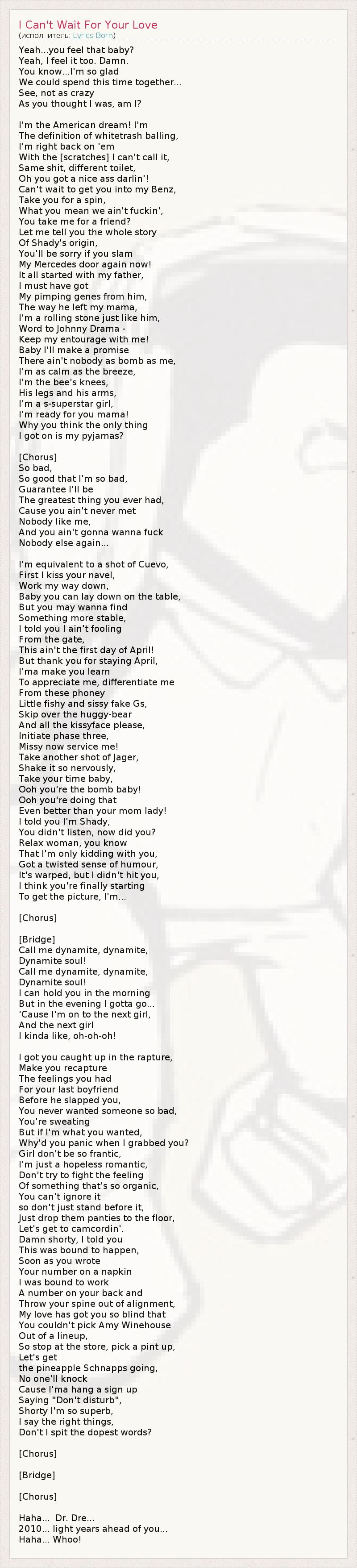 Yeah...you feel that baby? Yeah, I feel it too. Damn. You know...I'm so glad We could spend this time together... See, not as crazy As you thought I was, am I? I'm the American dream! I'm The definition of whitetrash balling, I'm right back on 'em With the [scratches] I can't call it, Same shit, different toilet, Oh you got a nice ass darlin'! Can't wait to get you into my Benz, Take you for a spin, What you mean we ain't fuckin', You take me for a friend? Let me tell you the whole story Of Shady's origin, You'll be sorry if you slam My Mercedes door again now! It all started with my father, I must have got My pimping genes from him, The way he left my mama, I'm a rolling stone just like him, Word to Johnny Drama - Keep my entourage with me! Baby I'll make a promise There ain't nobody as bomb as me, I'm as calm as the breeze, I'm the bee's knees, His legs and his arms, I'm a s-superstar girl, I'm ready for you mama! Why you think the only thing I got on is my pyjamas? [Chorus] So bad, So good that I'm so bad, Guarantee I'll be The greatest thing you ever had, Cause you ain't never met Nobody like me, And you ain't gonna wanna fuck Nobody else again... I'm equivalent to a shot of Cuevo, First I kiss your navel, Work my way down, Baby you can lay down on the table, But you may wanna find Something more stable, I told you I ain't fooling From the gate, This ain't the first day of April! But thank you for staying April, I'ma make you learn To appreciate me, differentiate me From these phoney Little fishy and sissy fake Gs, Skip over the huggy-bear And all the kissyface please, Initiate phase three, Missy now service me! Take another shot of Jager, Shake it so nervously, Take your time baby, Ooh you're the bomb baby! Ooh you're doing that Even better than your mom lady! I told you I'm Shady, You didn't listen, now did you? Relax woman, you know That I'm only kidding with you, Got a twisted sense of humour, It's warped, but I didn't hit you, I think you're finally starting To get the picture, I'm... [Chorus] [Bridge] Call me dynamite, dynamite, Dynamite soul! Call me dynamite, dynamite, Dynamite soul! I can hold you in the morning But in the evening I gotta go... 'Cause I'm on to the next girl, And the next girl I kinda like, oh-oh-oh! I got you caught up in the rapture, Make you recapture The feelings you had For your last boyfriend Before he slapped you, You never wanted someone so bad, You're sweating But if I'm what you wanted, Why'd you panic when I grabbed you? Girl don't be so frantic, I'm just a hopeless romantic, Don't try to fight the feeling Of something that's so organic, You can't ignore it so don't just stand before it, Just drop them panties to the floor, Let's get to camcordin'. Damn shorty, I told you This was bound to happen, Soon as you wrote Your number on a napkin I was bound to work A number on your back and Throw your spine out of alignment, My love has got you so blind that You couldn't pick Amy Winehouse Out of a lineup, So stop at the store, pick a pint up, Let's get the pineapple Schnapps going, No one'll knock Cause I'ma hang a sign up Saying "Don't disturb", Shorty I'm so superb, I say the right things, Don't I spit the dopest words? [Chorus] [Bridge] [Chorus] Haha... Dr. Dre... 2010... light years ahead of you... Haha... Whoo!