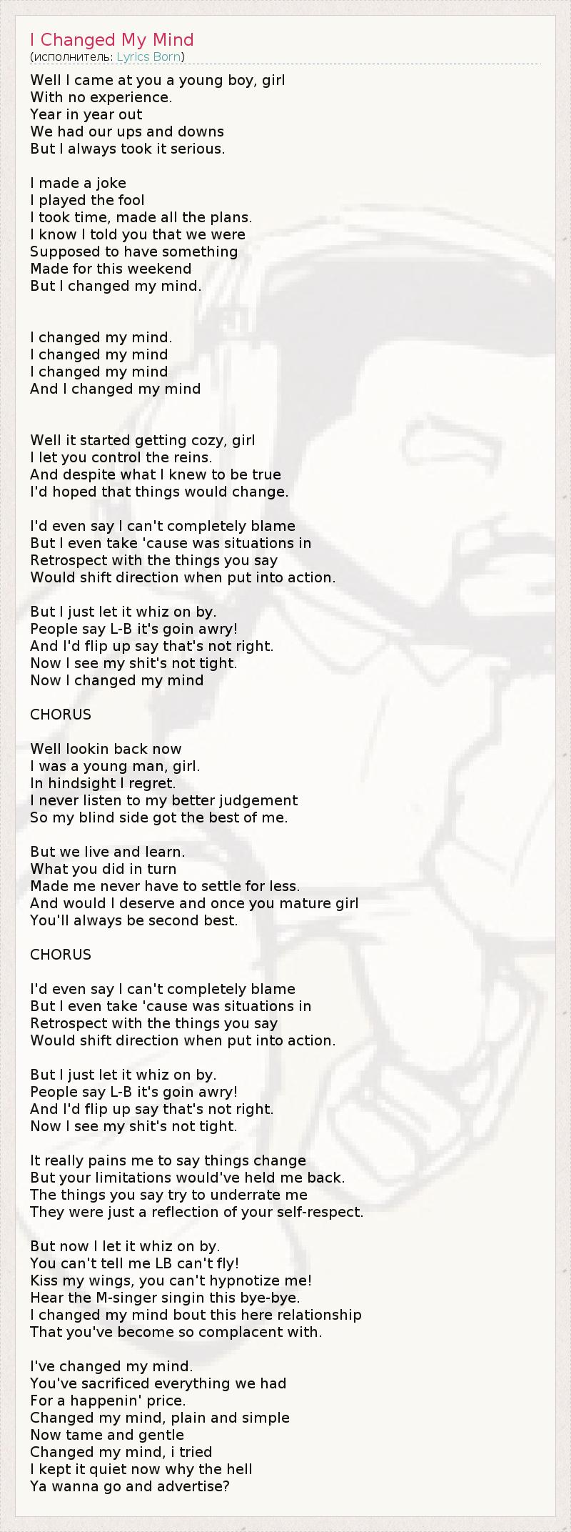 Well I came at you a young boy, girl With no experience. Year in year out We had our ups and downs But I always took it serious. I made a joke I played the fool I took time, made all the plans. I know I told you that we were Supposed to have something Made for this weekend But I changed my mind. I changed my mind. I changed my mind I changed my mind And I changed my mind Well it started getting cozy, girl I let you control the reins. And despite what I knew to be true I'd hoped that things would change. I'd even say I can't completely blame But I even take 'cause was situations in Retrospect with the things you say Would shift direction when put into action. But I just let it whiz on by. People say L-B it's goin awry! And I'd flip up say that's not right. Now I see my shit's not tight. Now I changed my mind CHORUS Well lookin back now I was a young man, girl. In hindsight I regret. I never listen to my better judgement So my blind side got the best of me. But we live and learn. What you did in turn Made me never have to settle for less. And would I deserve and once you mature girl You'll always be second best. CHORUS I'd even say I can't completely blame But I even take 'cause was situations in Retrospect with the things you say Would shift direction when put into action. But I just let it whiz on by. People say L-B it's goin awry! And I'd flip up say that's not right. Now I see my shit's not tight. It really pains me to say things change But your limitations would've held me back. The things you say try to underrate me They were just a reflection of your self-respect. But now I let it whiz on by. You can't tell me LB can't fly! Kiss my wings, you can't hypnotize me! Hear the M-singer singin this bye-bye. I changed my mind bout this here relationship That you've become so complacent with. I've changed my mind. You've sacrificed everything we had For a happenin' price. Changed my mind, plain and simple Now tame and gentle Changed my mind, i tried I kept it quiet now why the hell Ya wanna go and advertise?