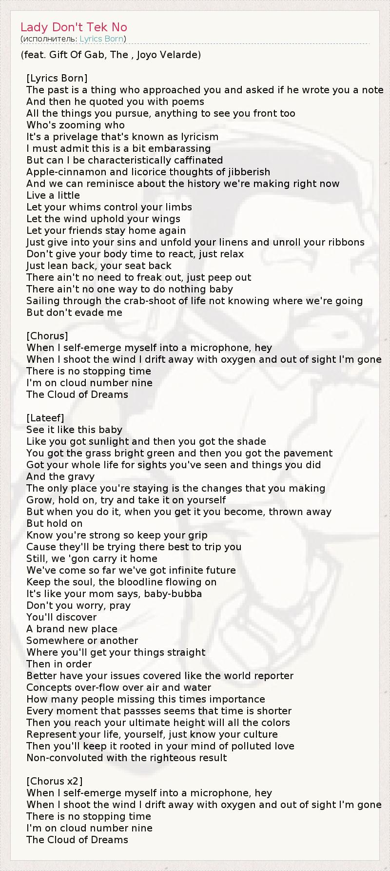 (feat. Gift Of Gab, The , Joyo Velarde) [Lyrics Born] The past is a thing who approached you and asked if he wrote you a note And then he quoted you with poems All the things you pursue, anything to see you front too Who's zooming who It's a privelage that's known as lyricism I must admit this is a bit embarassing But can I be characteristically caffinated Apple-cinnamon and licorice thoughts of jibberish And we can reminisce about the history we're making right now Live a little Let your whims control your limbs Let the wind uphold your wings Let your friends stay home again Just give into your sins and unfold your linens and unroll your ribbons Don't give your body time to react, just relax Just lean back, your seat back There ain't no need to freak out, just peep out There ain't no one way to do nothing baby Sailing through the crab-shoot of life not knowing where we're going But don't evade me [Chorus] When I self-emerge myself into a microphone, hey When I shoot the wind I drift away with oxygen and out of sight I'm gone There is no stopping time I'm on cloud number nine The Cloud of Dreams [Lateef] See it like this baby Like you got sunlight and then you got the shade You got the grass bright green and then you got the pavement Got your whole life for sights you've seen and things you did And the gravy The only place you're staying is the changes that you making Grow, hold on, try and take it on yourself But when you do it, when you get it you become, thrown away But hold on Know you're strong so keep your grip Cause they'll be trying there best to trip you Still, we 'gon carry it home We've come so far we've got infinite future Keep the soul, the bloodline flowing on It's like your mom says, baby-bubba Don't you worry, pray You'll discover A brand new place Somewhere or another Where you'll get your things straight Then in order Better have your issues covered like the world reporter Concepts over-flow over air and water How many people missing this times importance Every moment that passses seems that time is shorter Then you reach your ultimate height will all the colors Represent your life, yourself, just know your culture Then you'll keep it rooted in your mind of polluted love Non-convoluted with the righteous result [Chorus x2] When I self-emerge myself into a microphone, hey When I shoot the wind I drift away with oxygen and out of sight I'm gone There is no stopping time I'm on cloud number nine The Cloud of Dreams