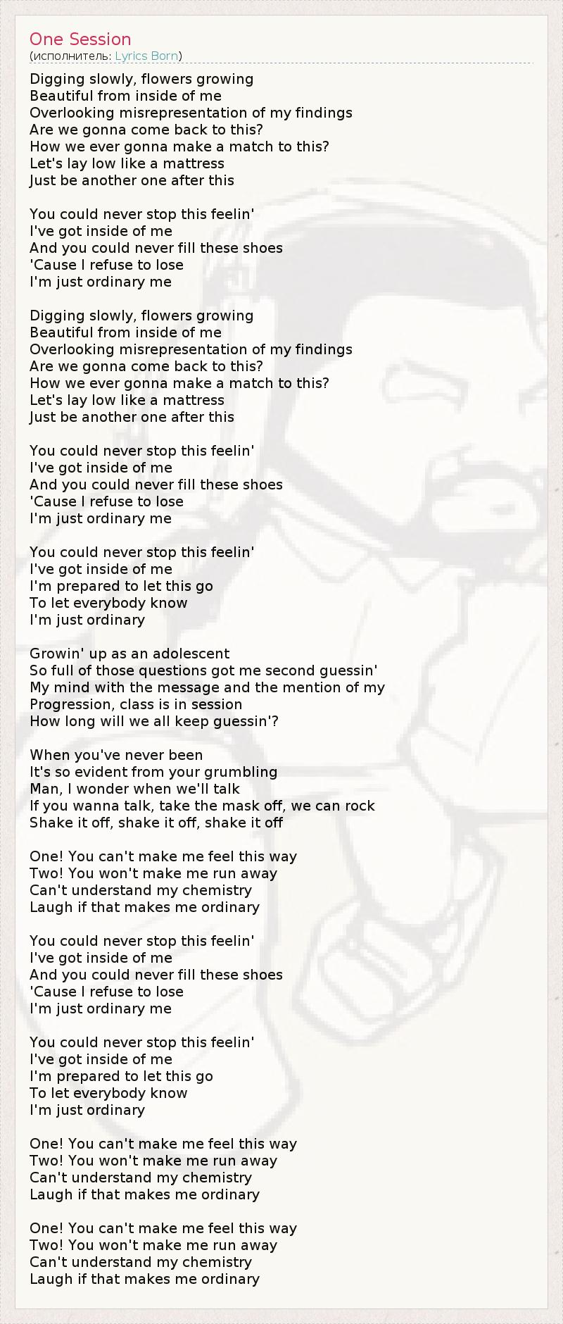 Digging slowly, flowers growing Beautiful from inside of me Overlooking misrepresentation of my findings Are we gonna come back to this? How we ever gonna make a match to this? Let's lay low like a mattress Just be another one after this You could never stop this feelin' I've got inside of me And you could never fill these shoes 'Cause I refuse to lose I'm just ordinary me Digging slowly, flowers growing Beautiful from inside of me Overlooking misrepresentation of my findings Are we gonna come back to this? How we ever gonna make a match to this? Let's lay low like a mattress Just be another one after this You could never stop this feelin' I've got inside of me And you could never fill these shoes 'Cause I refuse to lose I'm just ordinary me You could never stop this feelin' I've got inside of me I'm prepared to let this go To let everybody know I'm just ordinary Growin' up as an adolescent So full of those questions got me second guessin' My mind with the message and the mention of my Progression, class is in session How long will we all keep guessin'? When you've never been It's so evident from your grumbling Man, I wonder when we'll talk If you wanna talk, take the mask off, we can rock Shake it off, shake it off, shake it off One! You can't make me feel this way Two! You won't make me run away Can't understand my chemistry Laugh if that makes me ordinary You could never stop this feelin' I've got inside of me And you could never fill these shoes 'Cause I refuse to lose I'm just ordinary me You could never stop this feelin' I've got inside of me I'm prepared to let this go To let everybody know I'm just ordinary One! You can't make me feel this way Two! You won't make me run away Can't understand my chemistry Laugh if that makes me ordinary One! You can't make me feel this way Two! You won't make me run away Can't understand my chemistry Laugh if that makes me ordinary