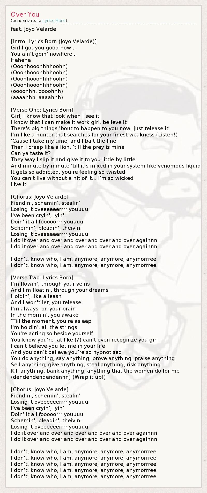 feat. Joyo Velarde [Intro: Lyrics Born (Joyo Velarde)] Girl I got you good now... You ain't goin' nowhere... Hehehe (Ooohhooohhhhoohh) (Ooohhooohhhhoohh) (Ooohhooohhhhoohh) (Ooohhooohhhhoohh) (oooohhh, oooohhh) (aaaahhh, aaaahhh) [Verse One: Lyrics Born] Girl, I know that look when I see it I know that I can make it work girl, believe it There's big things 'bout to happen to you now, just release it I'm like a hunter that searches for your finest weakness (Listen!) 'Cause I take my time, and I bait the line Then I creep like a lion, 'till the prey is mine Can ya taste it? They way I slip it and give it to you little by little And minute by minute 'till it's mixed in your system like venomous liquid It gets so addicted, you're feeling so twisted You can't live without a hit of it... I'm so wicked Live it [Chorus: Joyo Velarde] Fiendin', schemin', stealin' Losing it oveeeeeerrrr youuuu I've been cryin', lyin' Doin' it all fooooorrr youuuu Schemin', pleadin', theivin' Losing it oveeeeeerrrr youuuu I do it over and over and over and over and over againnn I do it over and over and over and over and over againnn I don't, know who, I am, anymore, anymore, anymorrree I don't, know who, I am, anymore, anymore, anymorrree [Verse Two: Lyrics Born] I'm flowin', through your veins And I'm floatin', through your dreams Holdin', like a leash And I won't let, you release I'm always, on your brain In the mornin', you awake 'Till the moment, you're asleep I'm holdin', all the strings You're acting so beside yourself You know you're fat like (?) can't even recognize you girl I can't believe you let me in your life And you can't believe you're so hypnotised You do anything, say anything, prove anything, praise anything Sell anything, give anything, steal anything, risk anything Kill anything, bank anything, anything that the women do for me (dendendendendennn) (Wrap it up!) [Chorus: Joyo Velarde] Fiendin', schemin', stealin' Losing it oveeeeeerrrr youuuu I've been cryin', lyin' Doin' it all fooooorrr youuuu Schemin', pleadin', theivin' Losing it oveeeeeerrrr youuuu I do it over and over and over and over and over againnn I do it over and over and over and over and over againnn I don't, know who, I am, anymore, anymore, anymorrree I don't, know who, I am, anymore, anymore, anymorrree I don't, know who, I am, anymore, anymore, anymorrree I don't, know who, I am, anymore, anymore, anymorrree I don't, know who, I am, anymore, anymore, anymorrree