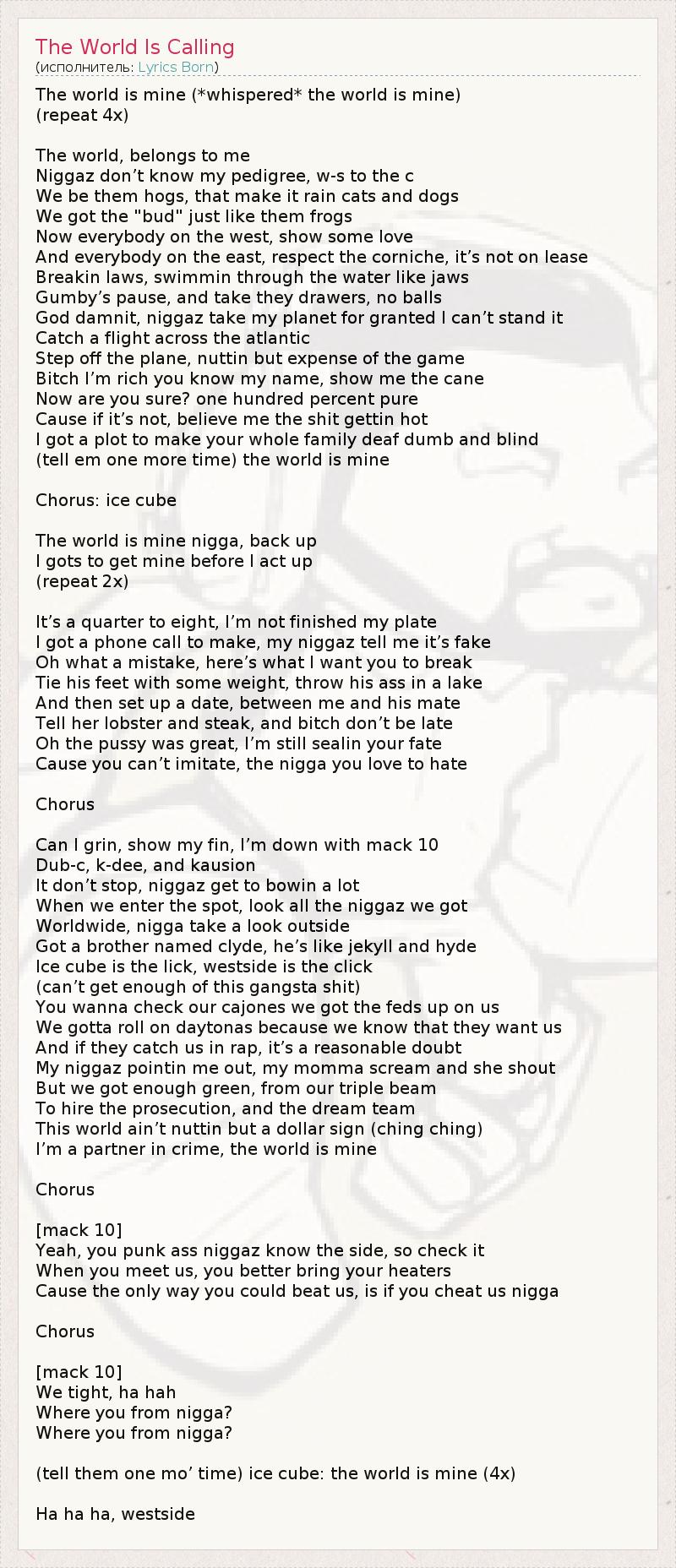 The world is mine (*whispered* the world is mine) (repeat 4x) The world, belongs to me Niggaz don’t know my pedigree, w-s to the c We be them hogs, that make it rain cats and dogs We got the "bud" just like them frogs Now everybody on the west, show some love And everybody on the east, respect the corniche, it’s not on lease Breakin laws, swimmin through the water like jaws Gumby’s pause, and take they drawers, no balls God damnit, niggaz take my planet for granted I can’t stand it Catch a flight across the atlantic Step off the plane, nuttin but expense of the game Bitch I’m rich you know my name, show me the cane Now are you sure? one hundred percent pure Cause if it’s not, believe me the shit gettin hot I got a plot to make your whole family deaf dumb and blind (tell em one more time) the world is mine Chorus: ice cube The world is mine nigga, back up I gots to get mine before I act up (repeat 2x) It’s a quarter to eight, I’m not finished my plate I got a phone call to make, my niggaz tell me it’s fake Oh what a mistake, here’s what I want you to break Tie his feet with some weight, throw his ass in a lake And then set up a date, between me and his mate Tell her lobster and steak, and bitch don’t be late Oh the pussy was great, I’m still sealin your fate Cause you can’t imitate, the nigga you love to hate Chorus Can I grin, show my fin, I’m down with mack 10 Dub-c, k-dee, and kausion It don’t stop, niggaz get to bowin a lot When we enter the spot, look all the niggaz we got Worldwide, nigga take a look outside Got a brother named clyde, he’s like jekyll and hyde Ice cube is the lick, westside is the click (can’t get enough of this gangsta shit) You wanna check our cajones we got the feds up on us We gotta roll on daytonas because we know that they want us And if they catch us in rap, it’s a reasonable doubt My niggaz pointin me out, my momma scream and she shout But we got enough green, from our triple beam To hire the prosecution, and the dream team This world ain’t nuttin but a dollar sign (ching ching) I’m a partner in crime, the world is mine Chorus [mack 10] Yeah, you punk ass niggaz know the side, so check it When you meet us, you better bring your heaters Cause the only way you could beat us, is if you cheat us nigga Chorus [mack 10] We tight, ha hah Where you from nigga? Where you from nigga? (tell them one mo’ time) ice cube: the world is mine (4x) Ha ha ha, westside