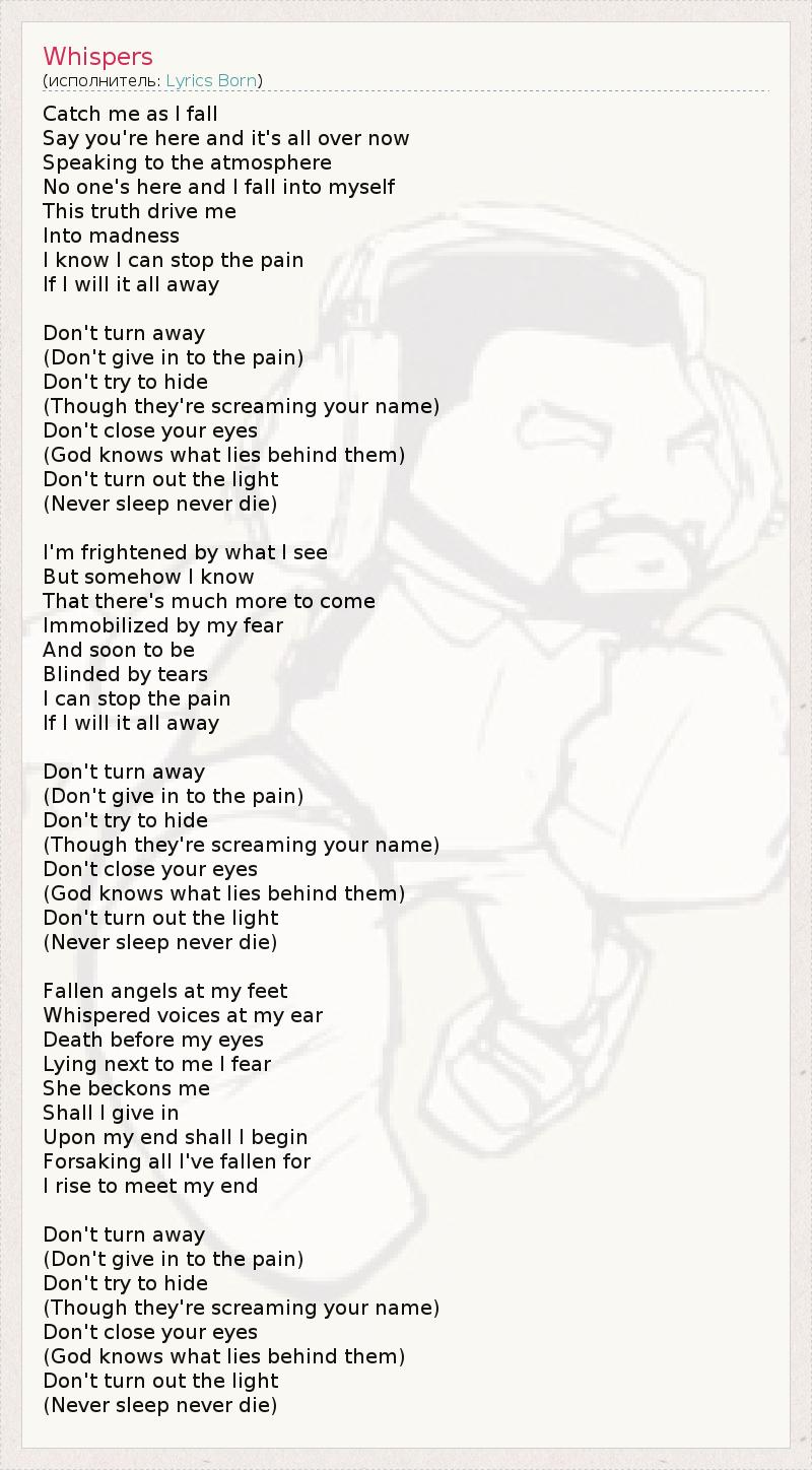 Будь мне опорой в нелёгкие времена. Скажи, что будешь рядом и что всё плохое позади. Но я разговариваю с пустотой. Здесь никого нет, и я погружаюсь в себя. Эта правда Сводит меня с ума. Я знаю, что могу остановить боль, И она больше не вернётся. Не отворачивайся, (Не сдавайся боли). Не пытайся спрятаться, (Даже если они выкрикивают твоё имя). Не закрывай глаза, (Один Бог знает, что ты увидишь, сомкнув веки). Не выключай свет, (Не засыпай, не умирай)… Меня пугает то, что я вижу. Но я знаю, Что многое ещё только впереди. Меня парализовал страх. Скоро Я ослепну от слёз. Я могу остановить боль, И она больше не вернётся. Не отворачивайся, (Не сдавайся боли). Не пытайся спрятаться, (Даже если они выкрикивают твоё имя). Не закрывай глаза, (Один Бог знает, что ты увидишь, сомкнув веки). Не выключай свет, (Не засыпай, не умирай)… Падшие ангелы у моих ног, Шёпот в ушах, Смерть прямо передо мной. Лёжа рядом со мной, Она манит меня. Мне сдаться ей? Поскольку это мой конец, Мне отречься от всего, что я любила? Я встаю, чтобы встретить свою кончину… Не отворачивайся, (Не сдавайся боли). Не пытайся спрятаться, (Даже если они выкрикивают твоё имя). Не закрывай глаза, (Один Бог знает, что ты увидишь, сомкнув веки). Не выключай свет, (Не засыпай, не умирай)…