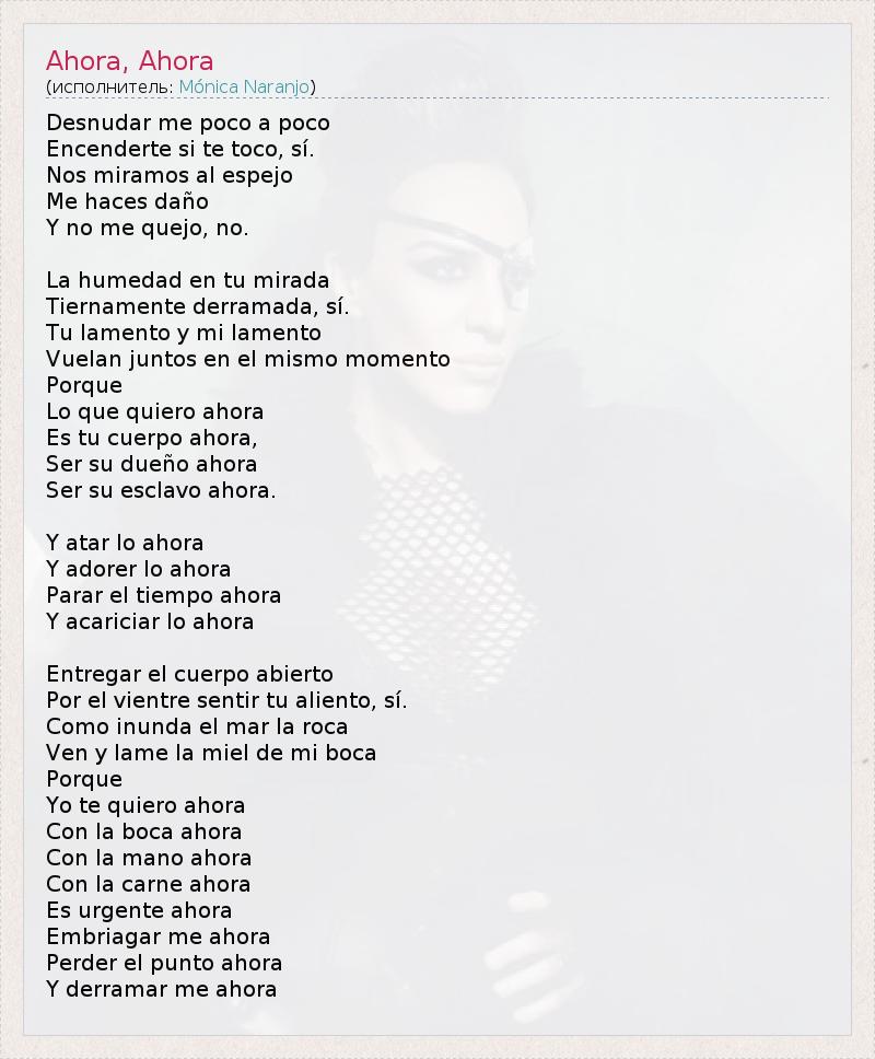 Desnudar me poco a poco Encenderte si te toco, sí. Nos miramos al espejo Me haces daño Y no me quejo, no. La humedad en tu mirada Tiernamente derramada, sí. Tu lamento y mi lamento Vuelan juntos en el mismo momento Porque Lo que quiero ahora Es tu cuerpo ahora, Ser su dueño ahora Ser su esclavo ahora. Y atar lo ahora Y adorer lo ahora Parar el tiempo ahora Y acariciar lo ahora Entregar el cuerpo abierto Por el vientre sentir tu aliento, sí. Como inunda el mar la roca Ven y lame la miel de mi boca Porque Yo te quiero ahora Con la boca ahora Con la mano ahora Con la carne ahora Es urgente ahora Embriagar me ahora Perder el punto ahora Y derramar me ahora