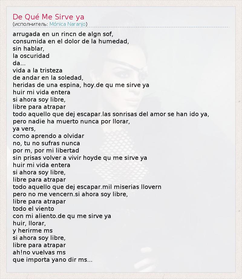 arrugada en un rincn de algn sof, consumida en el dolor de la humedad, sin hablar, la oscuridad da... vida a la tristeza de andar en la soledad, heridas de una espina, hoy.de qu me sirve ya huir mi vida entera si ahora soy libre, libre para atrapar todo aquello que dej escapar.las sonrisas del amor se han ido ya, pero nadie ha muerto nunca por llorar, ya vers, como aprendo a olvidar no, tu no sufras nunca por m, por mi libertad sin prisas volver a vivir hoyde qu me sirve ya huir mi vida entera si ahora soy libre, libre para atrapar todo aquello que dej escapar.mil miserias llovern pero no me vencern.si ahora soy libre, libre para atrapar todo el viento con mi aliento.de qu me sirve ya huir, llorar, y herirme ms si ahora soy libre, libre para atrapar ah!no vuelvas ms que importa yano dir ms...