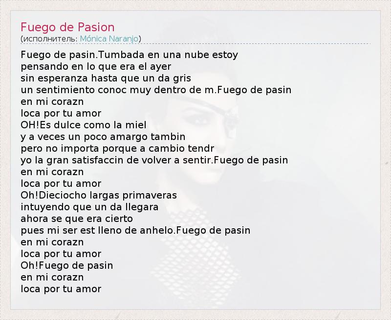 Fuego de pasin.Tumbada en una nube estoy pensando en lo que era el ayer sin esperanza hasta que un da gris un sentimiento conoc muy dentro de m.Fuego de pasin en mi corazn loca por tu amor OH!Es dulce como la miel y a veces un poco amargo tambin pero no importa porque a cambio tendr yo la gran satisfaccin de volver a sentir.Fuego de pasin en mi corazn loca por tu amor Oh!Dieciocho largas primaveras intuyendo que un da llegara ahora se que era cierto pues mi ser est lleno de anhelo.Fuego de pasin en mi corazn loca por tu amor Oh!Fuego de pasin en mi corazn loca por tu amor